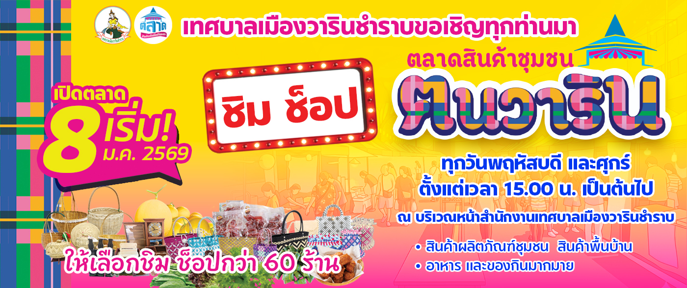เทศบาลเมืองวารินชำราบขอเชิญทุกท่านมา ชิม ช็อป ตลาดสินค้าชุมชน ฅนวาริน เปิดตลาด 8 ม.ค. 2569