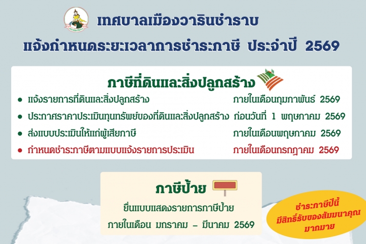 เทศบาลเมืองวารินชำราบ แจ้งกำหนดระยะเวลาการชำระภาษี ประจำปี 2569
