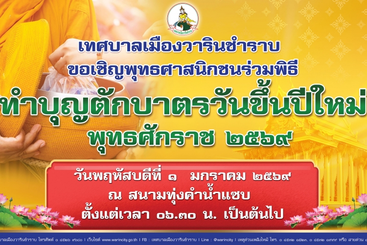 เทศบาลเมืองวารินชำราบ ขอเชิญพุทธศาสนิกชนร่วมทำบุญตักบาตรเนื่องในวันขึ้นปีใหม่ พ.ศ. 2569