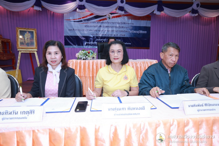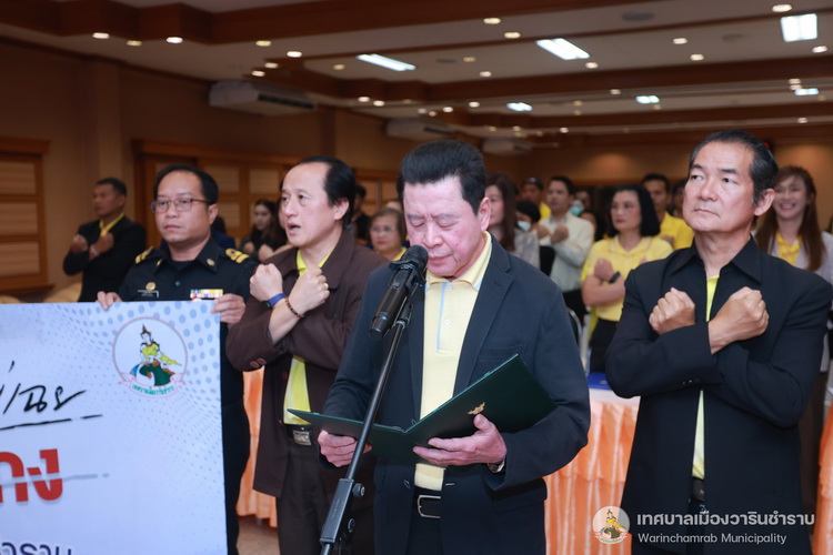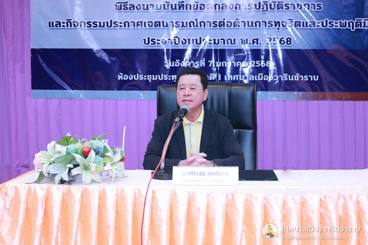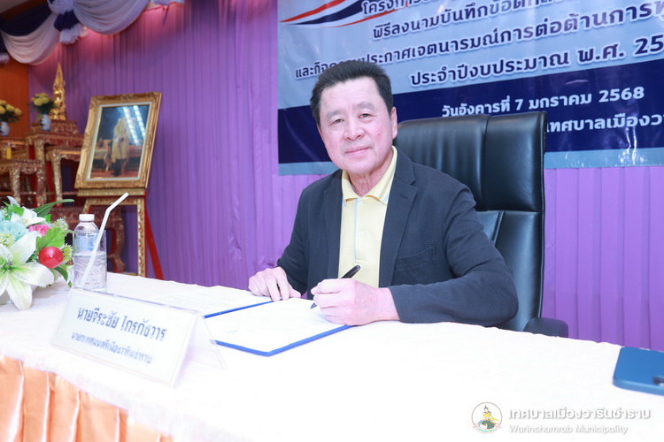 วันที่ 7 มกราคม 2568 เวลา 10.00 น. ณ ห้องประชุมประทุมเทพภักดี 1 เทศบาลเมืองวารินชำราบ ได้จัดโครงการประชุมมอบนโยบายการปฏิบัติราชการ พิธีลงนามในบันทึกข้อตกลงการปฏิบัติราชการ และกิจกรรมประกาศเจตนารมณ์การต่อต้านการทุจริตและประพฤติมิชอบ ประจำปีงบประมาณ 2568 โดยมีนายจีระชัย ไกรกังวาร นายกเทศมนตรี เป็นประธานในพิธี สำหรับการประชุมในครั้งนี้ นายจีระชัย ไกรกังวาร นายกเทศมนตรี ได้มอบนโยบายการปฏิบัติราชการ แก่หัวหน้าส่วนการงาน, พนักงานเทศบาล พร้อมด้วยคณะผู้บริหารสถานศึกษา เพื่อสร้างความรู้ความเข้าใจในนโยบายและหลักการดำเนินงานของเทศบาล อีกทั้งยังเป็นการปลูกฝังสร้างจิตสำนึกแก่พนักงานให้มีความรับผิดชอบในหน้าที่ ตามที่ได้รับมอบหมาย รวมถึงยังเป็นการส่งเสริมและสร้างขวัญกำลังใจที่ดีในการทำงาน พร้อมกันนี้นายจีระชัย ไกรกังวาร นายกเทศมนตรี ร่วมพิธีลงนามในบันทึกข้อตกลงการปฏิบัติราชการ และประกาศเจตนารมณ์นโยบายไม่รับของขวัญและของกำนัลทุกชนิดจากการปฏิบัติหน้าที่ (No Gift Policy) และประกาศเจตจำนงสุจริตในการบริหารงาน ตามนโยบายคุณธรรมและความโปร่งใส เพื่อเป็นมาตรฐานแนวทางปฏิบัติ และค่านิยมสำหรับข้าราชการและบุคลากรขององค์กร ในการดำเนินงานตามภารกิจด้วยความโปร่งใส ซื่อสัตย์สุจริต มีคุณธรรม ปราศจากการทุจริต รวมทั้งเน้นยำให้บุคลากรในสังกัดเทศบาลเมืองวาริน ถือปฏิบัติตามประกาศเจตนารมณ์นโยบายไม่รับของขวัญและของกำนัลทุกชนิดจากการปฏิบัติหน้าที่ (No Gift Policy) และการดำเนินการตามประมวลจริยธรรม อย่างเคร่งครัด และให้นำหลักเกณฑ์ตามประมวลจริยธรรมที่เกี่ยวข้องไปใช้ในการปฏิบัติตน และรักษาคุณงามความดีที่เจ้าหน้าที่ของรัฐต้องยึดถือปฏิบัติ รวมถึงแนวทางการปฏิบัติตนทางจริยธรรม (Do’s & Don’ts) ข้อควรทำ ข้อไม่ควรทำ ไปใช้ในการปฏิบัติงาน
