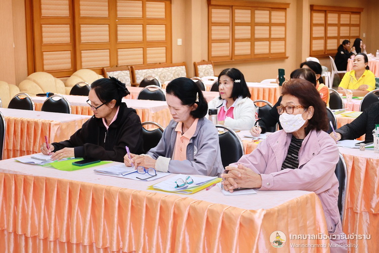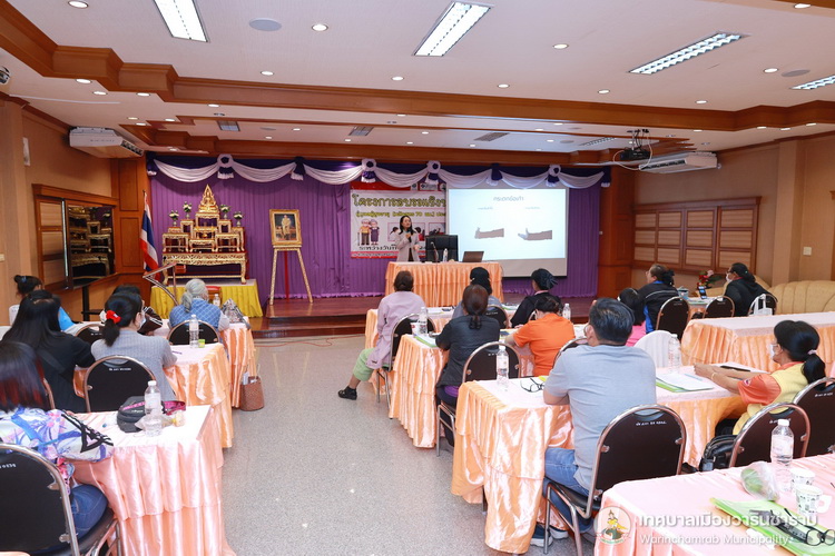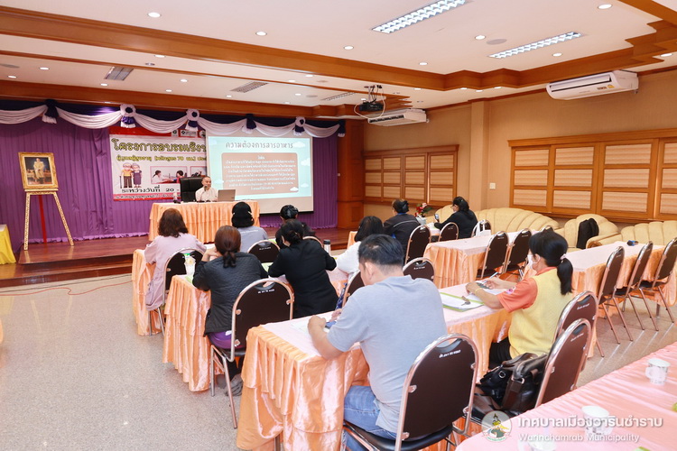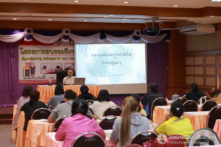 วันที่ 23 มกราคม 2568 เวลา 09.00 น. ณ ห้องประชุมประทุมเทพภักดี 1 ศูนย์บริการสาธารณสุขแห่งที่ 2 เทศบาลเมืองวารินชำราบ ได้จัดโครงการอบรมเชิงปฏิบัติการผู้ดูแลผู้สูงอายุ (หลักสูตร 70 ชม.) ประจำปี 2568 วันที่ 4 ระหว่างวันที่ 20-24 มกราคม 2568 เพื่ออบรมให้ความรู้สำหรับผู้ดูแลผู้พิการและผู้ช่วยเหลือดูแลผู้ที่มีภาวะพึ่งพิง (CG) ให้มีความรู้ที่ถูกต้องเหมาะสม สำหรับการอบรมในครั้งนี้เป็นการให้ความรู้ในเรื่องอาหารและโภชนาการบำบัดโรคสำหรับผู้สูงอายุ โดย นายณัฐภรณ์ เมืองจันทร์ ตำแหน่ง นักโภชนาการ มาเป็นวิทยากรบรรยายให้ความรู้ในครั้งนี้