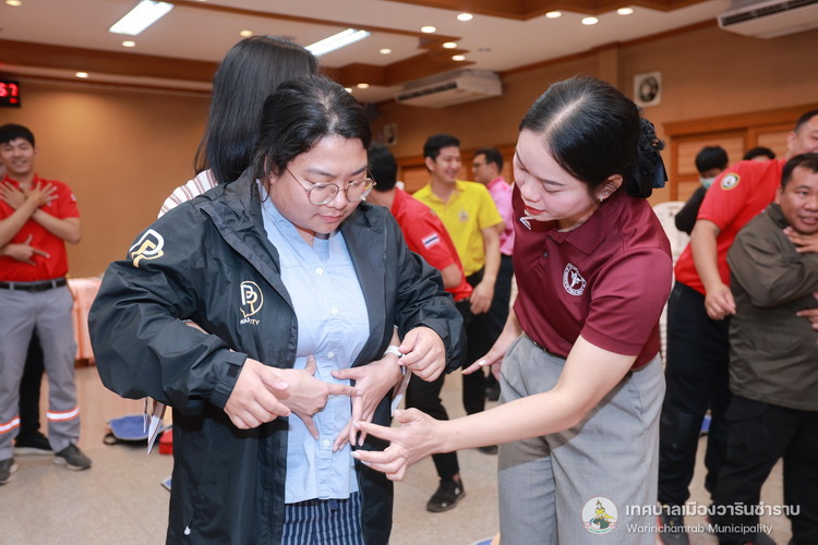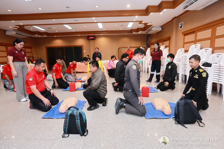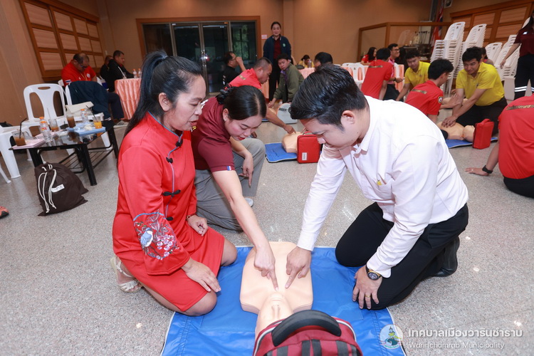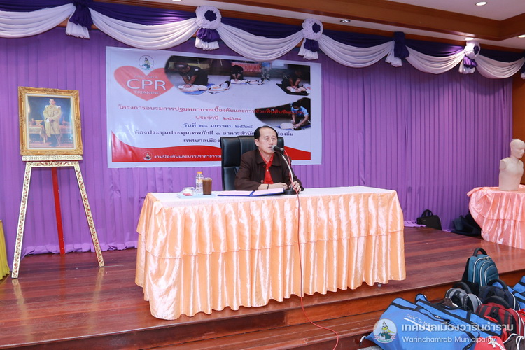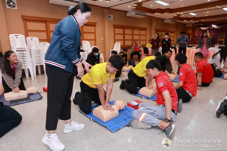 วันที่ 28 มกราคม 2568 เวลา 09.00 น. ฝ่ายป้องกันและบรรเทาสาธารณภัย สำนักปลัดเทศบาล จัดโครงการอบรมการปฐมพยาบาลเบื้องต้นและการช่วยฟื้นคืนชีพ (CPR) ประจำปี 2568 เพื่อให้ความรู้ความเข้าใจแก่พนักงานเทศบาลได้มีความรู้ความเข้าใจเบื้องต้นให้แก่ผู้ประสบภัยกรณีฉุกเฉินในการปฐมพยาบาลเบื้องต้นและการช่วยฟื้นคืนชีพ (CPR) ได้อย่างถูกต้อง รวดเร็ว มีประสิทธิภาพ และประสิทธิผล ถูกต้องตามหลักวิชาการ ลดการสูญเสียที่อาจจะเกิดขึ้นให้น้อยที่สุด โดยในพิธีได้รับเกียรติจากนายณรงชัย ประสิทธิ์ภูริปรีชา รองนายกเทศมนตรีมาเป็นประธาน พร้อมด้วยคณะผู้บริหาร สมาชิกสภาเทศบาล และหัวหน้าส่วนการงาน มาร่วมเป็นเกียรติ ซึ่งในการอบรมครั้งนี้ได้รับเกียรติจาก นางสาวอริสา สุพรรณ หัวหน้ากลุ่มงานควบคุมโรคไม่ติดต่อสุขภาพจิตและยาเสพติด สำนักงานสาธารณสุขจังหวัดอุบลราชธานี และคณะ เป็นวิทยากรบรรยายให้ความรู้ทั้งทั้งภาคทฤษฎีและภาคปฏิบัติในการอบรมในครั้งนี้