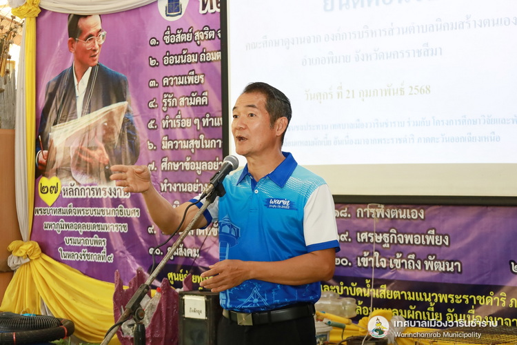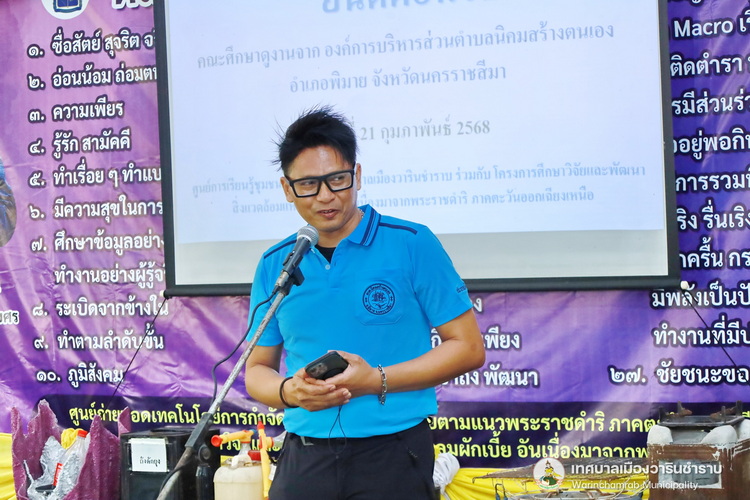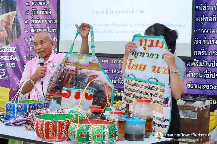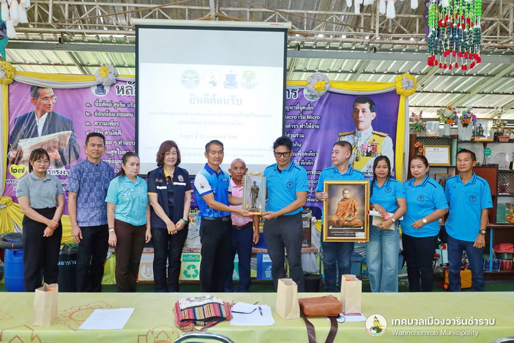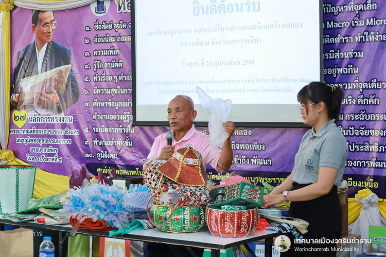 วันที่ 21 กุมภาพันธ์ 2568 เวลา 09.00 น. ณ ศูนย์เรียนรู้เพื่อการจัดการสิ่งแวดล้อมอย่างยั่งยืน ชุมชนชลประทาน นายจีระชัย ไกรกังวาร นายกเทศมนตรี ได้มอบหมายให้ นายบุญยง จินตนะกุล รองนายกเทศมนตรี พร้อมด้วย หัวหน้าส่วนการงานเทศบาลเมืองวารินชำราบ และคณะทำงานศูนย์การเรียนรู้ฯ ชุมชนชลประทาน ให้การต้อนรับคณะผู้บริหาร สมาชิกสภาองค์การบริหารส่วนตำบล หัวหน้าส่วนการงาน พนักงาน จากองค์การบริหารส่วนตำบลนิคมสร้างตนเอง อำเภอพิมาย จังหวัดนครราชสีมา นำโดยนายบุญชู ศรีโพธิ์ นายกองค์การบริหารส่วนตำบลนิคมสร้างตนเอง ในการศึกษาดูงานด้านการบริหารจัดการขยะภายในชุมชนของชุมชนชลประทาน ซึ่งเป็นชุมชนต้นแบบในเขตเทศบาลเมืองวารินชำราบที่ประสบความสำเร็จในการลดปริมาณขยะภายในชุมชน ภายใต้การทำกิจกรรมโครงการชุมชนปลอดขยะ Zero Waste ด้วยการนำขยะมารีไซเคิลผลิตเป็นสิ่งของเครื่องใช้ต่างๆ อาทิ ถังขยะลดโลกร้อน,ไม้กวาดจากขวดพลาสติก, เสื่อจากถุงพลาสติก, ผ้ากันเปื้อนจากป้ายไวนิล, เตาชีวมวลจากหม้อหุงข้าวที่ไม่ใช้แล้ว เป็นต้น