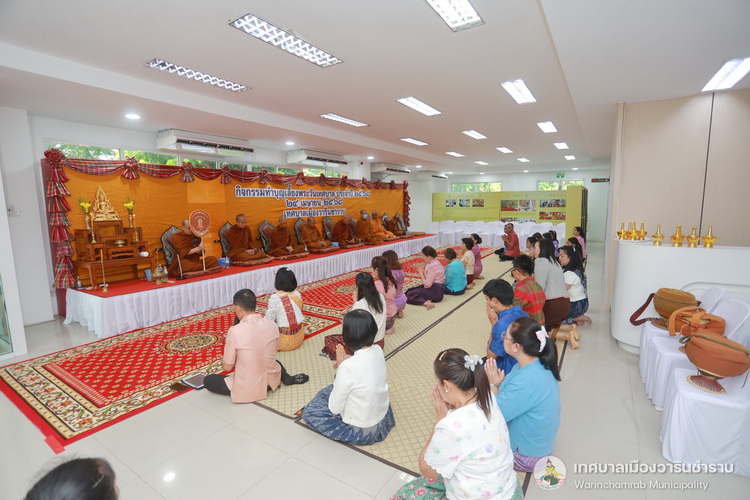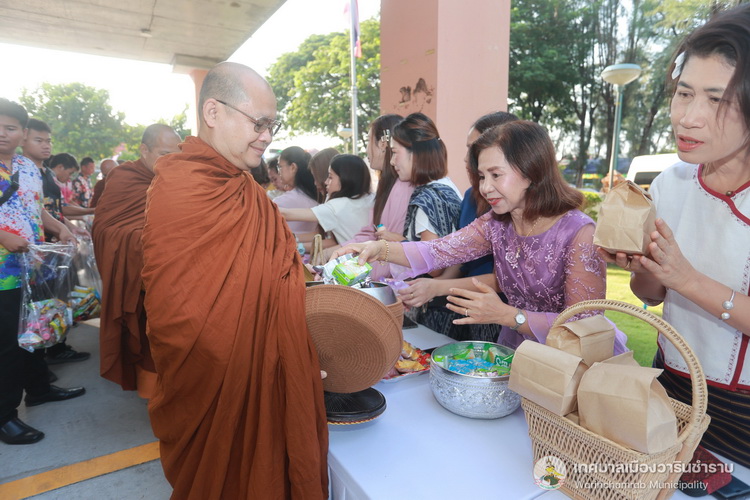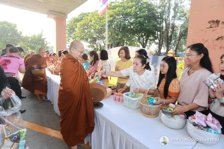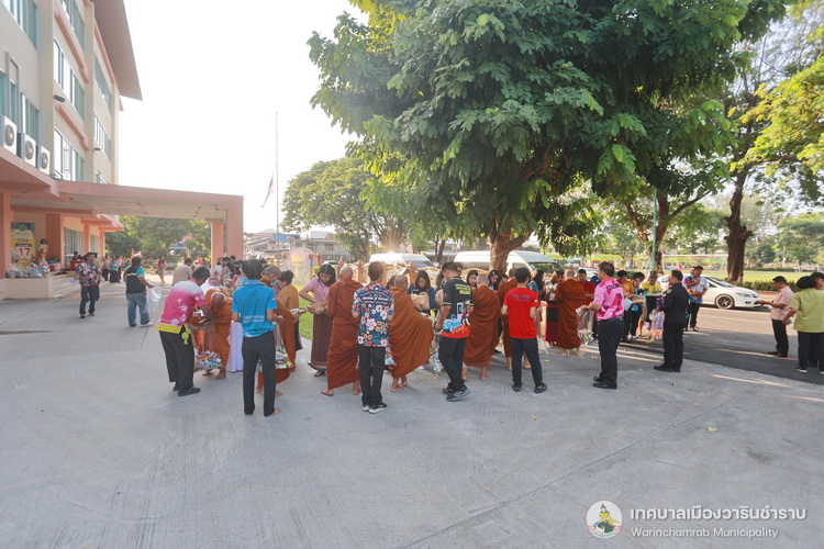 วันที่ 24 เมษายน 2568 เวลา 07.00 น. นางรุ่งนภา ทับหนองฮี รองปลัดเทศบาล รักษาราชการแทนปลัดเทศบาล ปฏิบัติหน้าที่นายกเทศมนตรีเมืองวารินชำราบ นำหัวหน้าส่วนราชการ พนักงานเทศบาล ผู้อำนวยการสถานศึกษา และพนักงานครูเทศบาลโรงเรียนในสังกัดเทศบาลเมืองวารินชำราบทั้ง 3 แห่ง ร่วมพิธีทำบุญตักบาตร พระสงฆ์ 8 รูป เนื่องในวันเทศบาล ประจำปี 2568 เพื่อความสิริมงคลแก่ตนเองและครอบครัว จากนั้นได้นำข้าวสารอาหารแห้งส่งมอบ ให้แก่ศูนย์บริการสาธารณสุขทั้ง 3 แห่ง เพื่อมอบให้ผู้ป่วยติดเตียง ต่อไป
