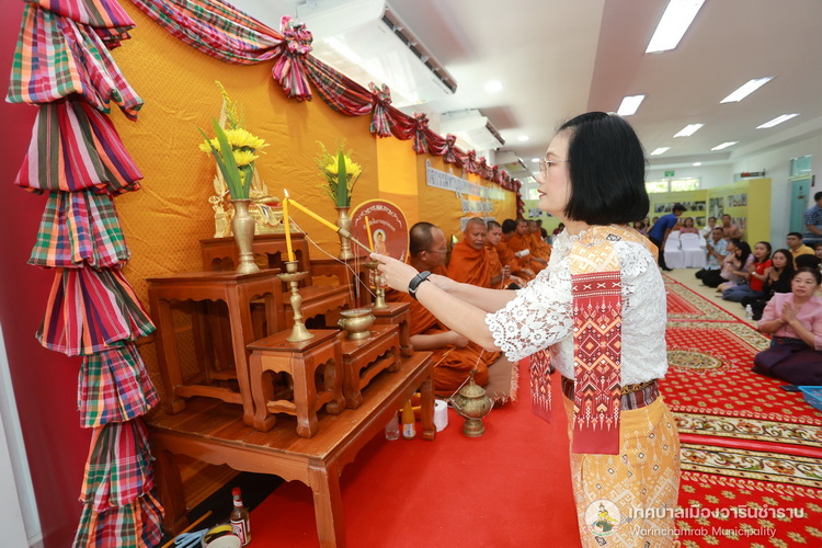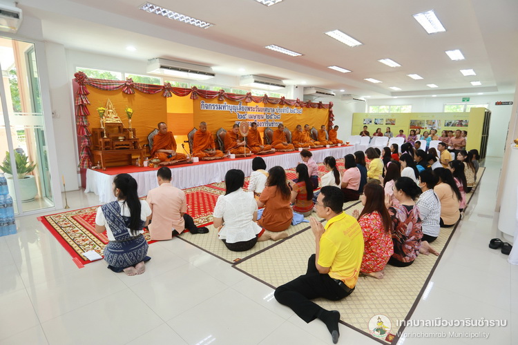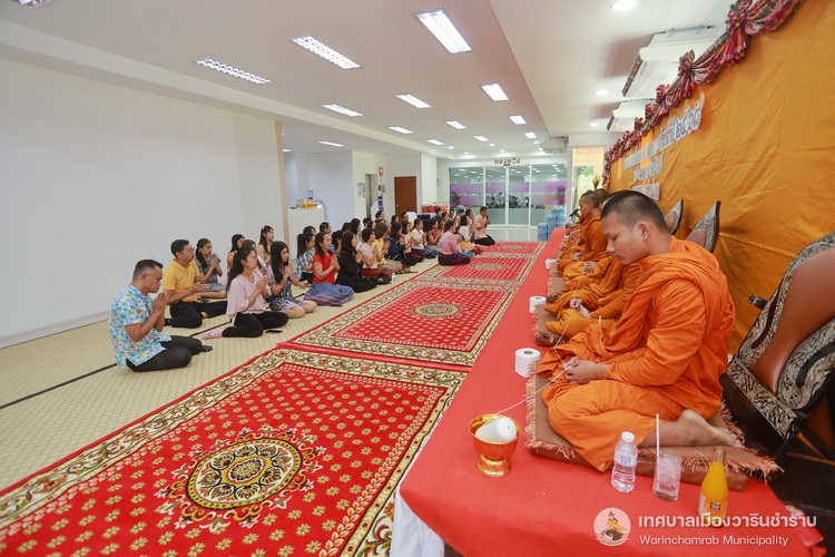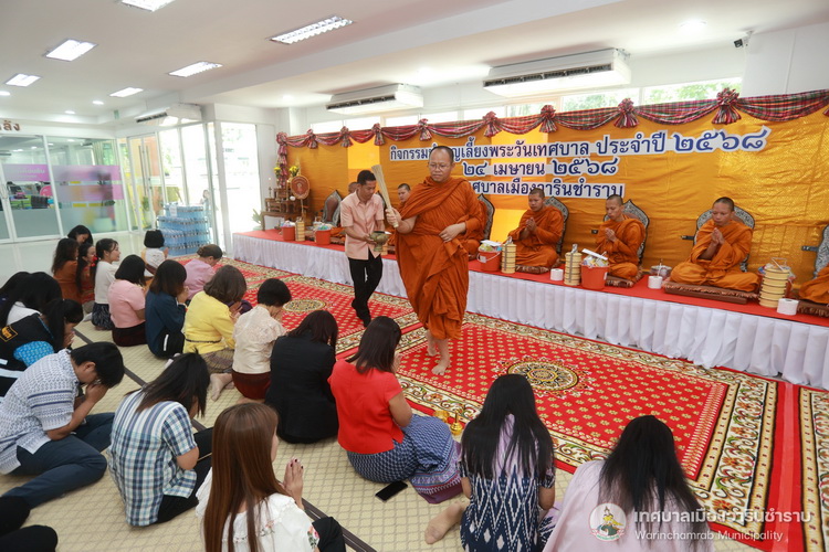 วันที่ 24 เมษายน 2568 เวลา 10.30 น. ณ อาคารสำนักงานใหม่ เทศบาลเมืองวารินชำราบ นางรุ่งนภา ทับหนองฮี รองปลัดเทศบาล รักษาราชการแทนปลัดเทศบาล ปฏิบัติหน้าที่นายกเทศมนตรีเมืองวารินชำราบ พร้อมด้วยหัวหน้าส่วนการงาน พนักงานเทศบาล ผู้บริหารและพนักงานครูจากโรงเรียนในสังกัด ลูกจ้างและพนักงานจ้าง ร่วมทำบุญถวายภัตตาหารเพลแด่พระภิกษุสงฆ์ เนื่องในวันเทศบาลประจำปี 2568 เพื่อเป็นการทำบุญอุทิศส่วนกุศลให้แก่เจ้าหน้าที่เทศบาล และญาติมิตรชาวเทศบาลที่ได้ล่วงลับไปแล้ว รวมถึงเพื่อความเป็นศิริมงคลและเป็นกุศลแก่ หัวหน้าส่วนการงาน พนักงานเทศบาล ผู้บริหารและพนักงานครูจากโรงเรียนในสังกัด และพนักงานเทศบาลเมืองวารินชำราบ