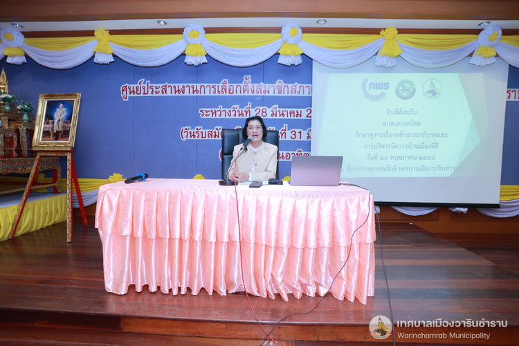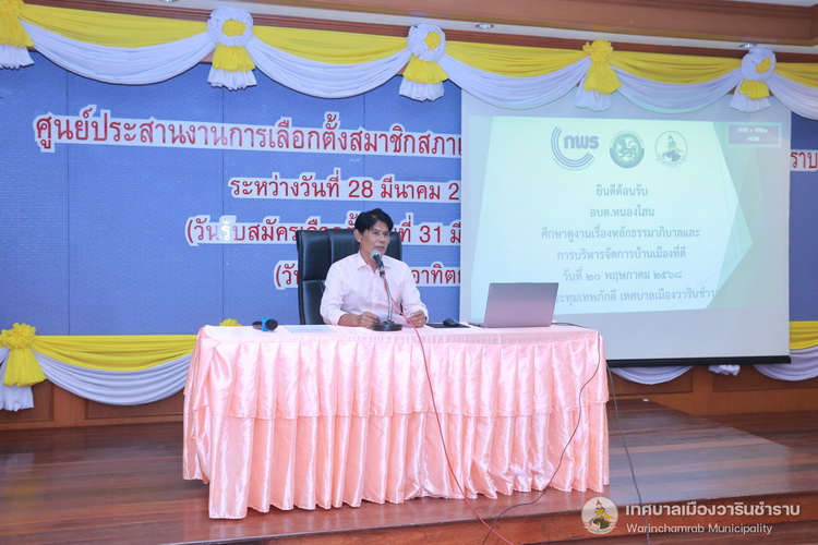 วันที่ 21 พฤษภาคม 2568 เวลา 13.00 น. นางรุ่งนภา ทับหนองฮี รองปลัดเทศบาล รักษาราชการแทน ปลัดเทศบาล ปฏิบัติหน้าที่นายกเทศมนตรีเมืองวารินชำราบ พร้อมด้วยหัวหน้าส่วนการงานเทศบาลเมืองวารินชำราบ ให้การต้อนรับ คณะผู้บริหาร และเจ้าหน้าที่จากองค์การบริหารส่วนตำบลหนองโสน อำเภอเมืองเพชรบุรี จังหวัดเพชรบุรี นำโดย นายยุทธนา เมืองเล็ก นายกองค์การบริหารส่วนตำบลหนองโสน ในการเข้าศึกษาดูงานด้านการบริหารจัดการที่ดีของเทศบาลเมืองวารินชำราบ เพื่อเป็นการแลกเปลี่ยนประสบการณ์ และแนวทางในพัฒนาการปฏิบัติงานให้มีประสิทธิภาพมากขึ้น ซึ่งในการบรรยายได้รับเกียรติจาก นางรุ่งนภา ทับหนองฮี หัวหน้าสำนักปลัดเทศบาล รักษาราชการแทนปลัดเทศบาล เป็นวิทยากร ทั้งนี้ในปี 2567 ที่ผ่านมา เทศบาลเมืองวารินชำราบ ได้เข้าร่วมการประกวดองค์กรปกครองส่วนท้องถิ่นที่มีการบริหารจัดการที่ดี ประจำปีงบประมาณ พ.ศ. 2567 โดยสามารถเข้าสู่รอบการประเมินในรอบสุดท้าย