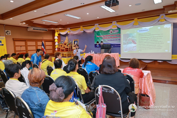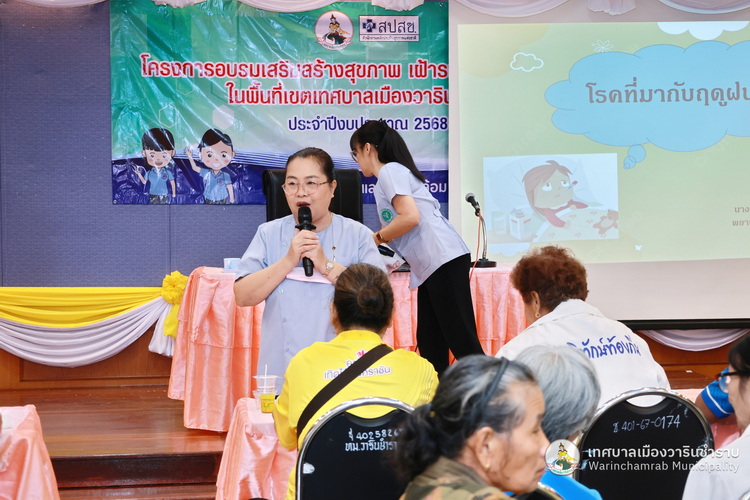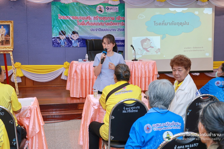 วันที่ 30 มิถุนายน 2568 เวลา 09.00 น. ณ ห้องประชุมประทุมเทพภักดี 1 งานศูนย์บริการสาธารณสุข กองสาธารณสุขและสิ่งแวดล้อม ได้จัดโครงการอบรมเสริมสร้างสุขภาพ เฝ้าระวังและป้องกันโรค ในพื้นที่เทศบาลเมืองวารินชำราบ แก่อาสาสมัครสาธารณสุข (อสม.) เทศบาลเมืองวารินชำราบ และประชาชนทั่วไป ประจำเดือนมิถุนายน 2568 เพื่อเป็นการให้ความรู้ในด้านการสาธารณสุข และทบทวนความรู้ด้านการส่งเสริมสุขภาพแก่คนในชุมชน รวมถึงการติดตามงานของ อสม. แต่ละชุมชน ในรอบเดือนที่ผ่านมา สำหรับการอบรมในครั้งนี้เป็นการให้ความรู้ในเรื่องของโรคที่มากับฤดูฝน โดยนางรัตยา ขันติคเชนชาติ พยาบาลวิชาชีพชำนาญการ จากโรงพยาบาลส่งเสริมสุขภาพตำบลเพียเภ้า มาเป็นวิทยากรให้ความรู้ในครั้งนี้