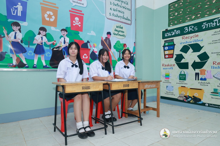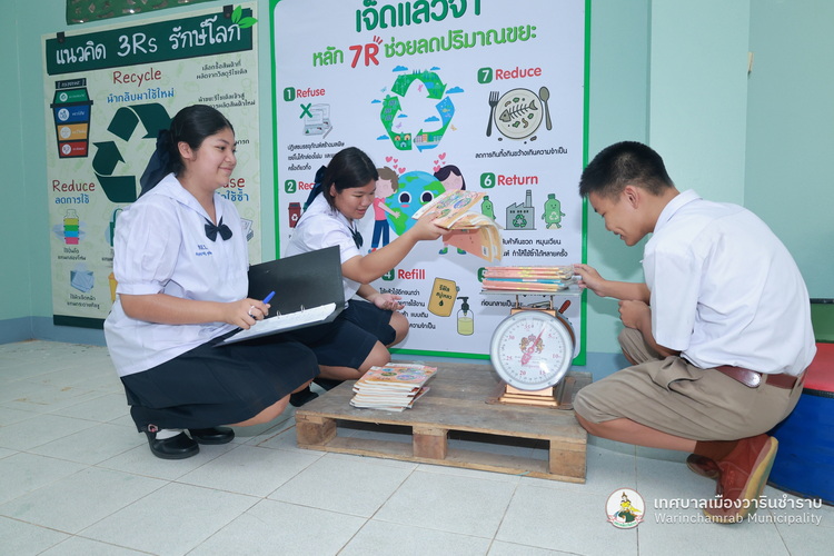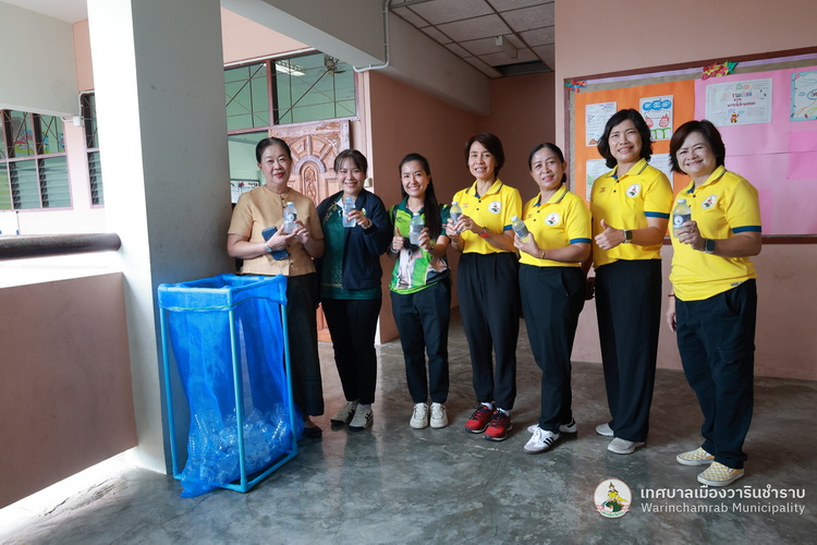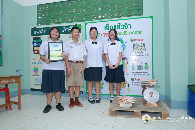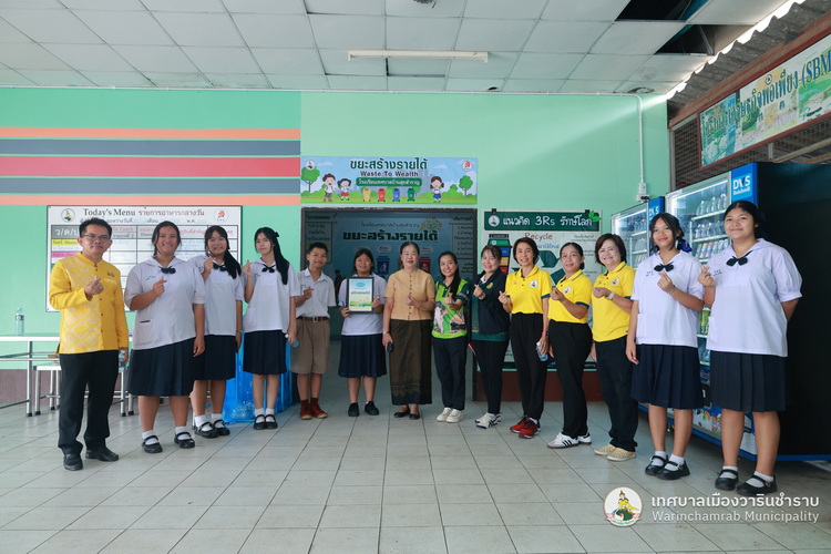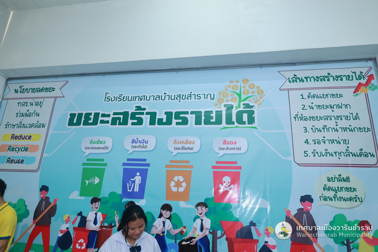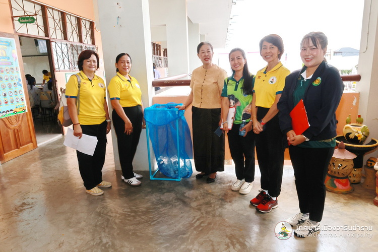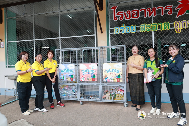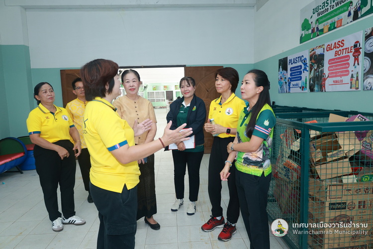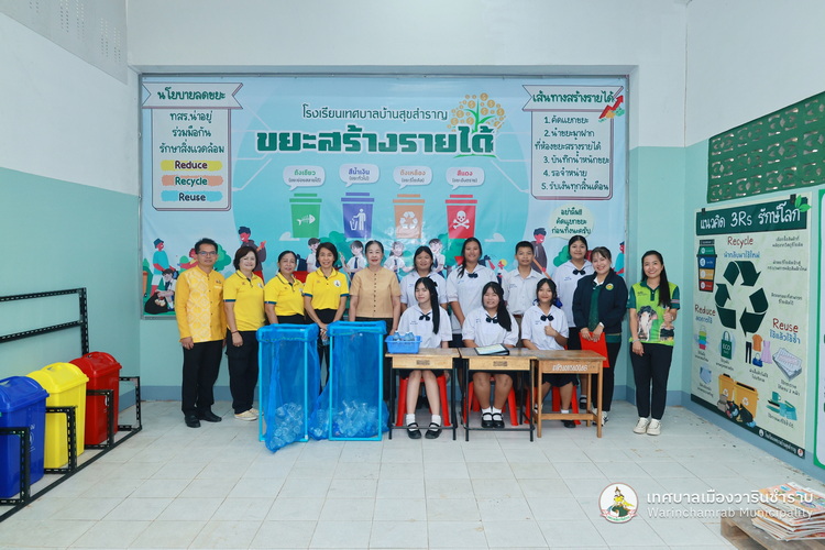 วันที่ 2 กรกฎาคม 2568 เวลา 09.00 น. นางพฤกษา ตั้งกิจวนิชกุล ผู้อำนวยการกองสาธารณสุข ฯ พร้อมด้วย เจ้าหน้าที่กองสาธารณสุขและสิ่งแวดล้อม เทศบาลเมืองวารินชำราบ ได้ลงพื้นที่ติดตามแนวทางการดำเนินงานธนาคารขยะของโรงเรียนเทศบาลบ้านสุขสำราญ ตามนโยบายการจัดตั้งธนาคารขยะในสถานศึกษาสังกัดขององค์กรปกครองส่วนท้องถิ่น (School Recyclable Waste Bank) ประจำปีงบประมาณ 2568 ของกรมส่งเสริมการปกครองส่วนท้องถิ่น ในการส่งเสริมให้เกิดการคัดแยกขยะต้นทาง สร้างจิตสำนึกในการคัดแยกขยะ ช่วยลดปริมาณขยะที่เกิดขึ้นภายในสถานศึกษาและชุมชน รวมถึงการเสริมสร้างองค์ความรู้ในการคัดแยกขยะรีไซเคิลที่ถูกต้องแก่นักเรียน รวมทั้งยังเป้นการขับเคลื่อนตามนโยบายของกระทรวงมหาดไทย ด้านที่ 3 การสร้างอาชีพ เพิ่มรายได้ให้กับประชาชน โดยมี ดร.ขวัญพธู อัครจันทร์ ผู้อำนวยการโรงเรียนเทศบาลบ้านสุขสำราญ พร้อมด้วย คณะครู ให้การต้อนรับ และพาเยี่ยมชมการดำเนินงานต่าง ๆ ในการคัดแยกขยะ และลดปริมาณขยะภายในโรงเรียน ด้วยแนวคิด 3Rs และหลัก 7R