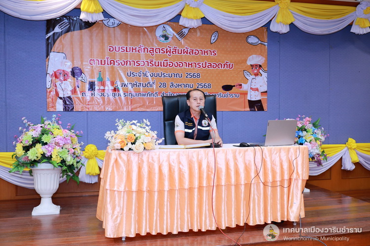 วันที่ 28 สิงหาคม 2568 เวลา 09.00 น. ณ ห้องประชุมประทุมเทพภักดี 1 นายจีระชัย ไกรกังวาร นายกเทศมนตรี ได้มอบหมายให้นายณรงชัย ประสิทธิ์ภูริปรีชา รองนายกเทศมนตรี พร้อมด้วยนายบุญยง จินตนะกุล รองนายกเทศมนตรี ,สมาชิกสภาเทศบาล และหัวหน้าส่วนการงาน ร่วมเป็นเกียรติ ในพิธีเปิดโครงการอบรมหลักสูตรผู้สัมผัสอาหารตามโครงการวารินเมืองอาหารปลอดภัย ประจำปีงบประมาณ 2568 เพื่อเป็นการให้ความรู้ในด้านสุขาภิบาลอาหาร และการประกอบการที่ถูกสุขลักษณะ รวมทั้งเพื่อเป็นการเฝ้าระวังและตรวจสอบคุณภาพความปลอดภัยของอาหาร และยังเป็นการประกันคุณภาพของอาหารในเขตเทศบาลเมืองวารินชำราบได้มาตรฐาน ซึ่งในการอบรมได้รับเกียรติจากนางสาวสุดาสวรรค์ สลักคำ นักวิชาการสาธารณสุขชำนาญการ จากกลุ่มงานอนามัยสิ่งแวดล้อม ศูนย์อนามัยที่ 10 อุบลราชธานี และนางสาวภาณุมาส ล้วนทอง นักวิชาการสาธารณสุขปฏิบัติการ จากศูนย์อนามัยที่ 10 อุบลราชธานี มาให้ความรู้แก่ผู้ประกอบการในการอบรมในครั้งนี้