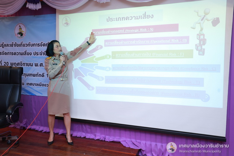 วันที่ 20 พฤศจิกายน 2567 เวลา 09.00 น. นายจีระชัย ไกรกังวาร นายกเทศมนตรีเมืองวารินชำราบ ได้มอบหมายให้นายบุญยง จินตนะกุล รองนายกเทศมนตรี เป็นประธานในการเปิดโครงการฝึกอบรมโครงการอบรมให้ความรู้และความเข้าใจเกี่ยวกับการจัดทำแผน การติดตามและการรายงานแผนบริหารจัดการความเสี่ยง ประจำปีงบประมาณ พ.ศ. 2568 ซึ่งการอบรมฯในครั้งนี้ได้รับเกียรติจาก นางรุ่งนภา ทับหนองฮี หัวหน้าสำนักปลัดเทศบาล รักษาราชการแทนปลัดเทศบาล มาเป็นวิทยากรให้ความรู้ในเรื่อง และความเข้าใจเกี่ยวกับการจัดทำแผนการติดตามและการรายงานแผนบริหารจัดการความเสี่ยง ประจำปีงบประมาณ พ.ศ. 2568 ตามพระราชบัญญัติวินัยการเงินการคลังของรัฐ พ.ศ. 2561 มาตรา 79 กำหนดให้หน่วยงานของรัฐจัดให้มีการตรวจสอบภายใน การควบคุมภายใน และการบริหารจัดการความเสี่ยงโดยให้ถือปฏิบัติตามประกาศมาตรฐานและหลักเกณฑ์ที่กระทรวงการคลังกำหนด เพื่อให้ผู้เข้ารับการฝึกอบรมมีความรู้ความเข้าใจ ในขั้นตอน วิธีการบริหารจัดการความเสี่ยง ตามแบบ บส. 1 - บส. 5 ได้อย่างถูกต้อง และเกิดประสิทธิภาพในการบริหารจัดการความเสี่ยงของเทศบาลเมืองวารินชำราบ