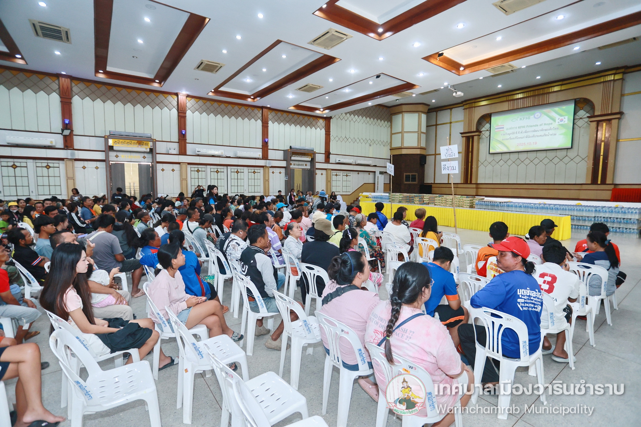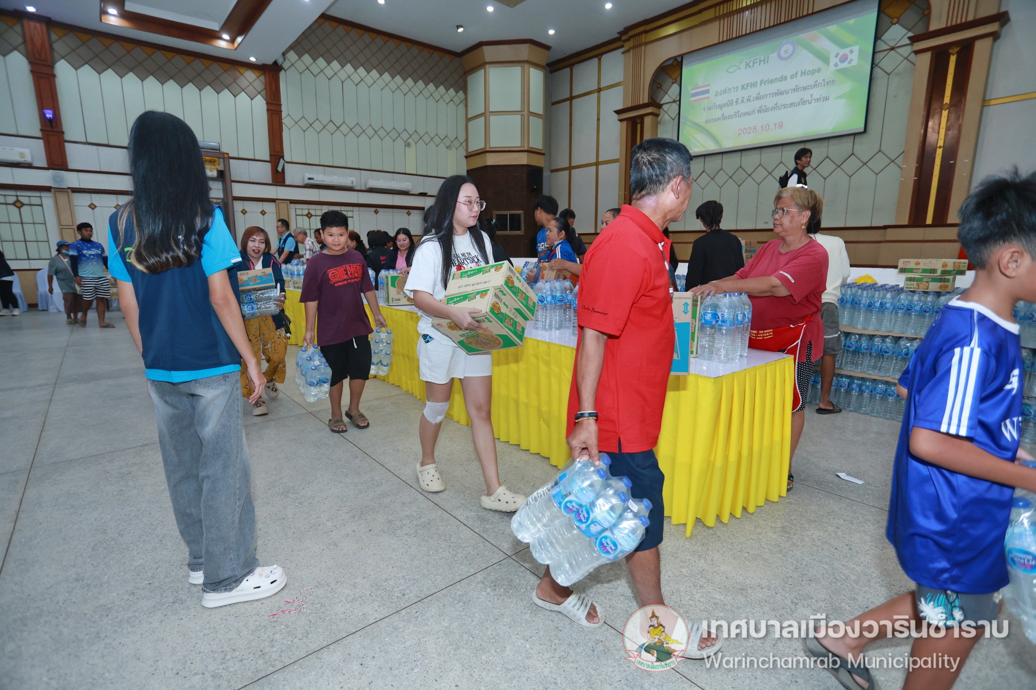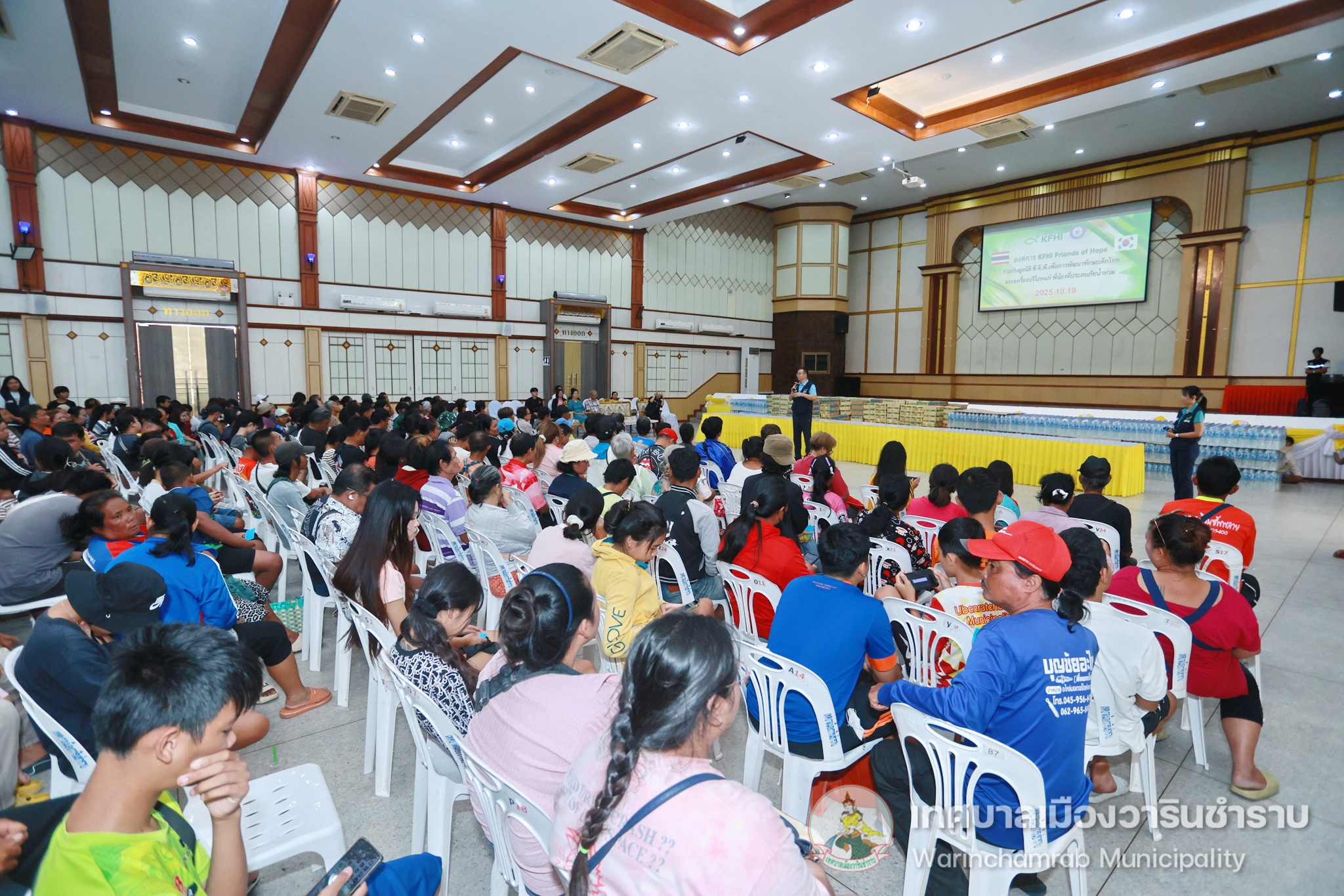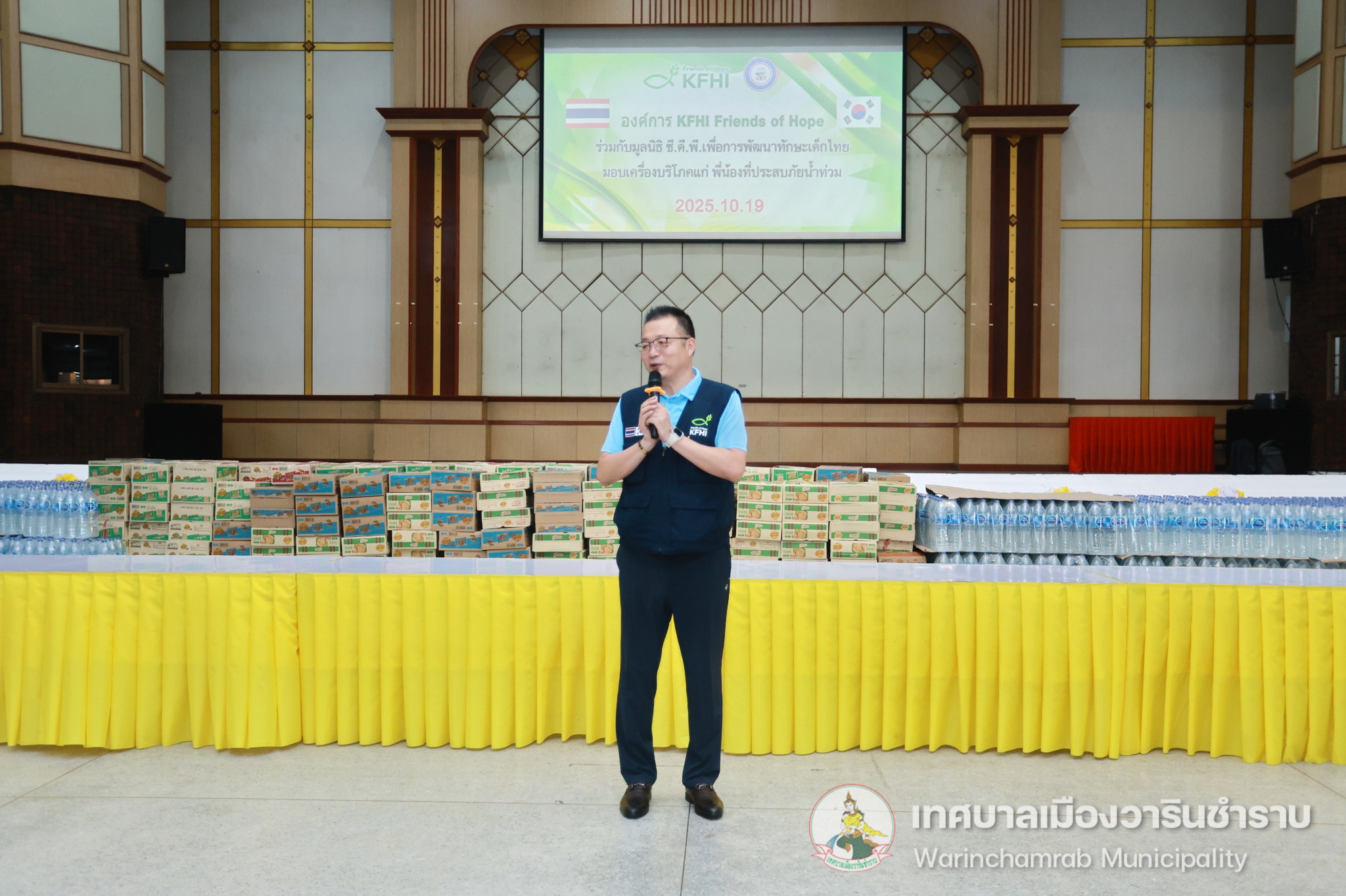 วันที่ 19 ตุลาคม 2568 เวลา 10.00 น. ณ หอประชุมประชาวาริน องค์การ KFHI Friends of Hope ร่วมกับมูลนิธิ ซี.ดี.พี. เพื่อการพัฒนาทักษะเด็กไทย นำทีมโดยศาสนาอาจารย์ดร.ฮง ซอง วอน , ชื่อมูลนิธิ ซี.ดี.พี. เพื่อการพัฒนาทักษะเด็กไทย ได้นำน้ำดื่ม และอาหารปรุงสุกมามอบให้แก่ประชาชนผู้ได้รับผลกระทบจากเหตุการณ์อุทกภัย ในเขตเทศบาลเมืองวารินชำราบจำนวนกว่า 500 ชุด เพื่อเป็นการช่วยเหลือบรรเทาความเดือดร้อน และให้กำลังใจแก่ประชาชนจากสถานการณ์อุทกภัยในครั้งนี้