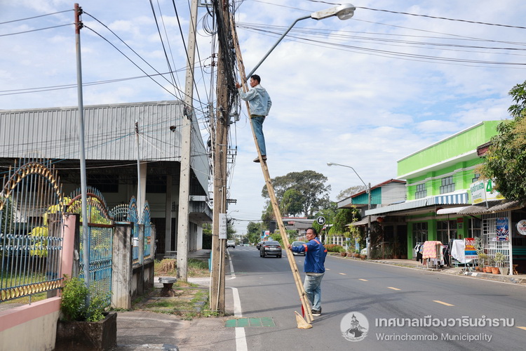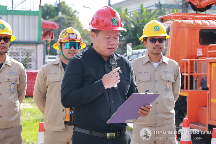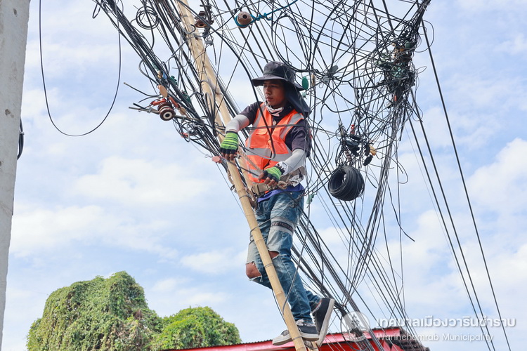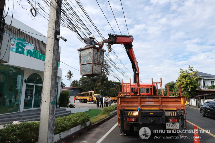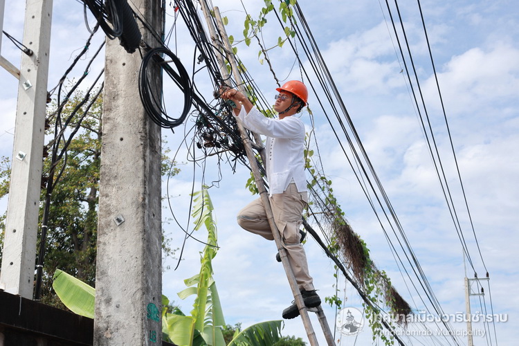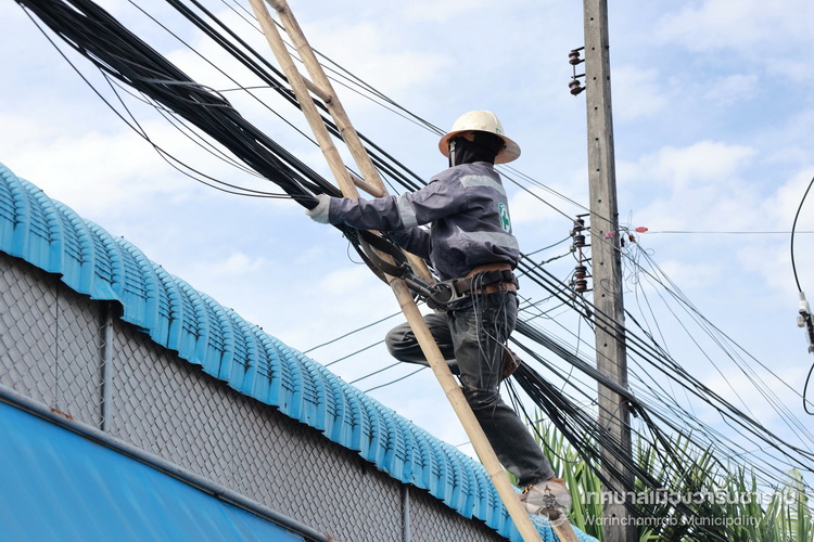 วันที่ 21 พฤศจิกายน 2568 เวลา 09.00 น. นายจีระชัย ไกรกังวาร นายกเทศมนตรีเมืองวารินชำราบ ได้มอบหมายให้ นางรุ่งนภา ทับหนองฮี รองปลัดเทศบาล รักษาราชการแทนปลัดเทศบาล พร้อมด้วยหัวหน้าส่วนราชการ ร่วมกับการไฟฟ้าฝ่ายผลิตแห่งประเทศไทย ภาคีเครือข่ายผู้ประกอบการ ร่วมโครงการ “บ้านเมืองน่าอยู่ สังคมปลอดภัย ร่วมใจจัดระเบียบสายสื่อสาร” มอบเป็นของขวัญให้แก่ชุมชน ในโอกาสครบรอบ 65 ปี PEA ในเขตพื้นที่ กฟฉ.2 ยกระดับความปลอดภัยให้กับประชาชนและปรับภูมิทัศน์ในพื้นที่ชุมชนให้มีความเป็นระเบียบเรียบร้อย เนื่องจากสายสัญญาณและสายไฟฟ้าไม่เป็นระเบียบ ซึ่งก่อให้เกิดอันตรายและบดบังทัศนียภาพ โดยคำนึงถึงความปลอดภัยต่อชุมชนและประชาชนที่สัญจรบนถนนเทศบาล 12