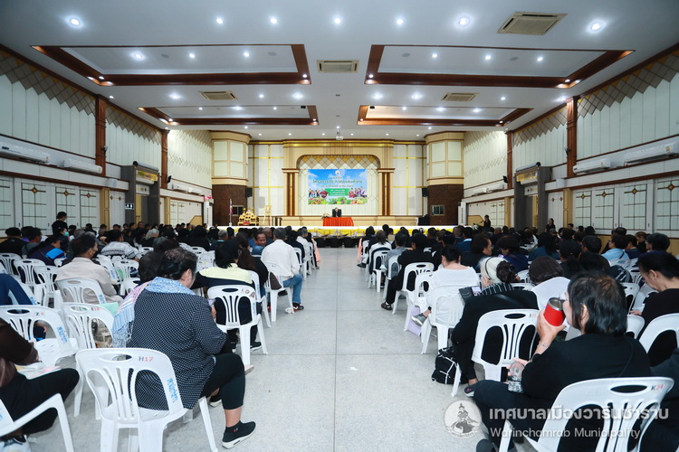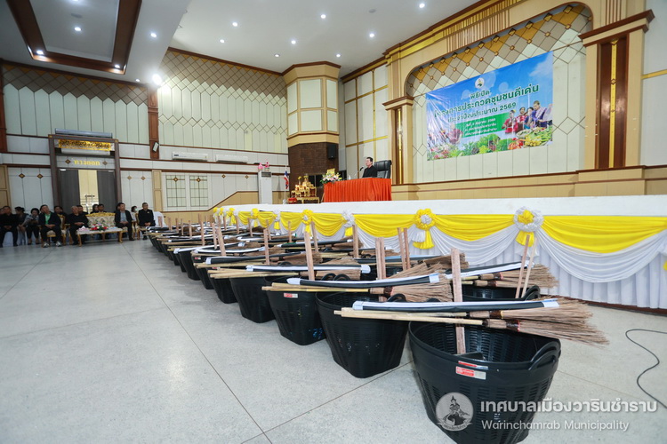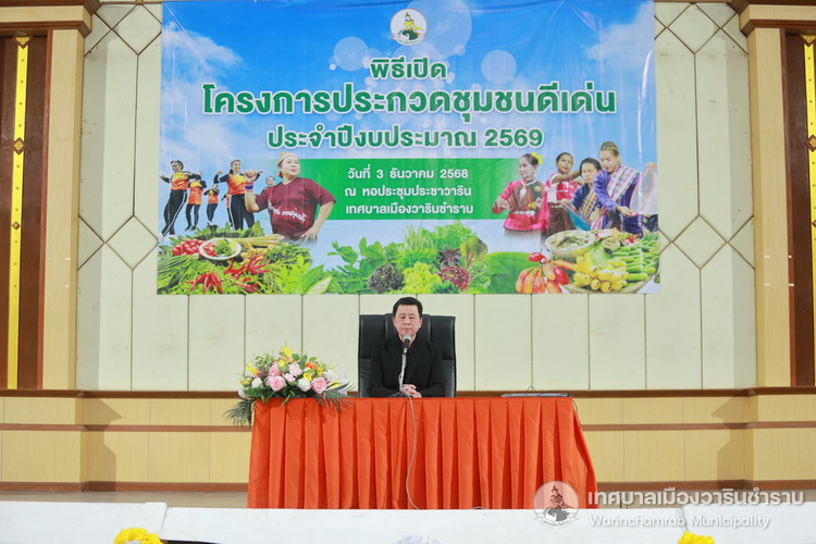วันที่ 3 ธันวาคม 2568 เวลา 09.00 น. ณ หอประชุมประชาวาริน นายจีระชัย ไกรกังวาร นายกเทศมนตรีเมืองวารินชำราบ มาเป็นประธานในพิธีเปิดโครงการพร้อมมอบนโยบาย และอุปกรณ์ทำความสะอาดให้แก่ชุมชนต่างๆ ร่วมกับสมาชิกสภาเทศบาล และหัวหน้าส่วนการงาน ซึ่งโครงการประกวดชุมชนดีเด่นในการรักษาความสะอาด และพัฒนาคุณภาพชีวิตของประชาชน ประจำปี 2569 เพื่อเป็นการส่งเสริมให้กลุ่มพลังมวลชน และอาสาสมัครของเทศบาลเมืองวารินชำราบ ได้มีส่วนร่วมในการดูแลรักษาความสะอาด และความเป็นระเบียบของบ้านเมือง รวมถึงยังเป็นการพัฒนาคุณภาพชีวิตของประชาชนให้ดีขึ้นในด้านสุขภาพ คุณภาพสังคม และสิ่งแวดล้อม ตามนโยบายวารินเมืองน่าอยู่ ผู้คนน่ารัก ซึ่งกิจกรรมในโครงการจะเป็นการอบรมให้ความรู้ในการประกวดชุมชนดีเด่นในด้านต่างๆ 4 ด้าน กิจกรรมรณรงค์ทำความสะอาดชุมชนทั้ง 28 ชุมชน และกิจกรรมมอบใบประกาศเกียรติคุณแก่ชุมชนที่ได้รับรางวัลประกวดชุมชนดีเด่น ซึ่งการอบรมในครั้งนี้ได้รับเกียรติจากนายอนุสรณ์ ส่องแสง พยาบาลวิชาชีพชำนาญการ ศูนย์อนามัยที่ 10 อุบลราชธานี มาเป็นวิทยากรให้ความรู้ในครั้งนี้