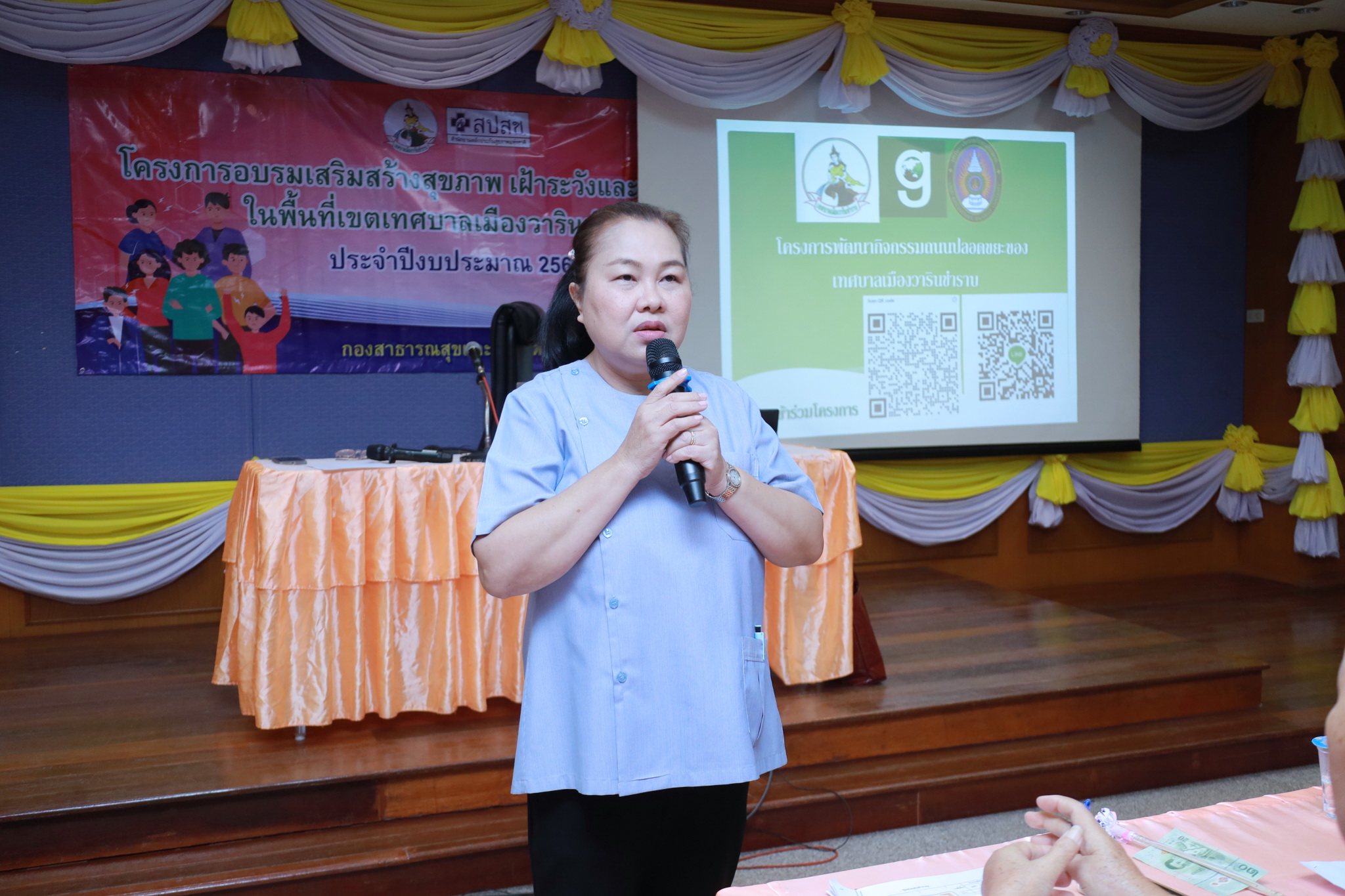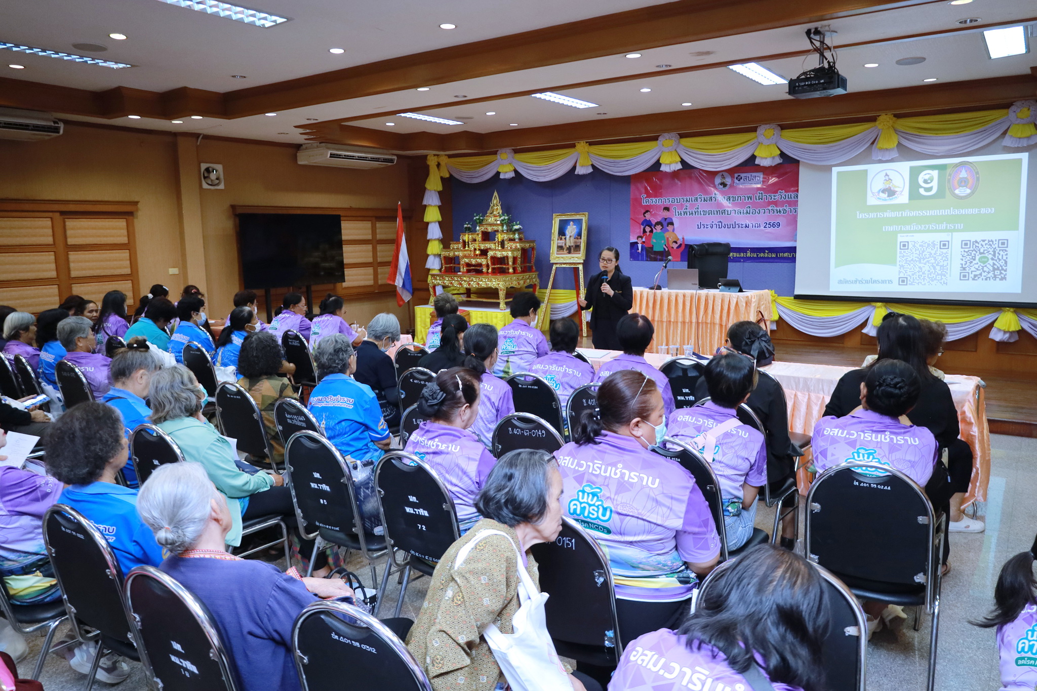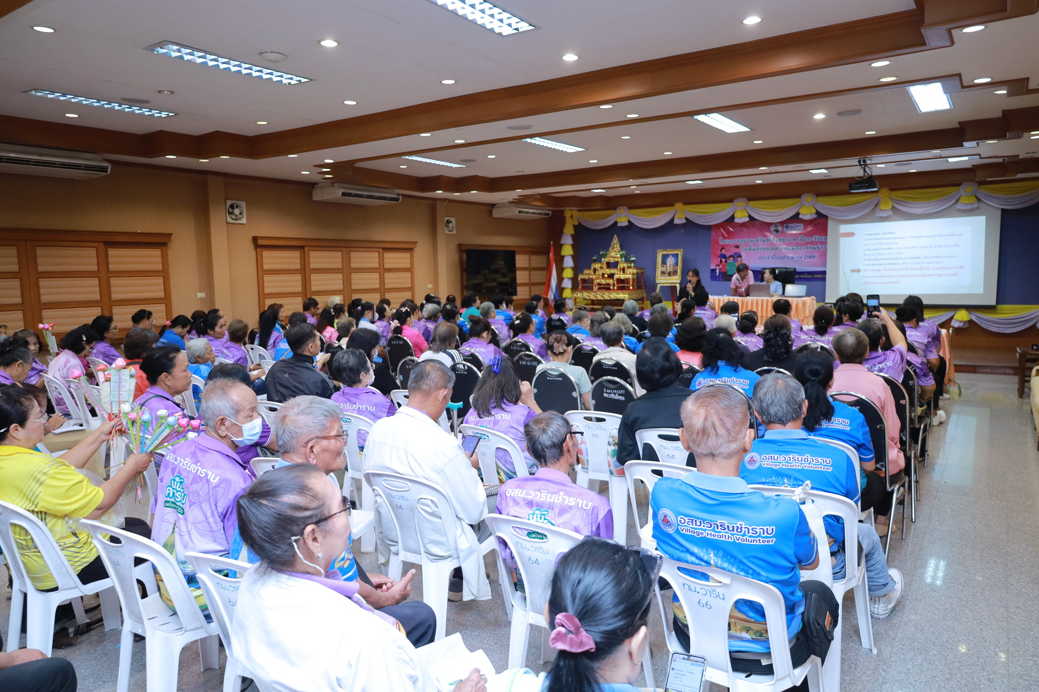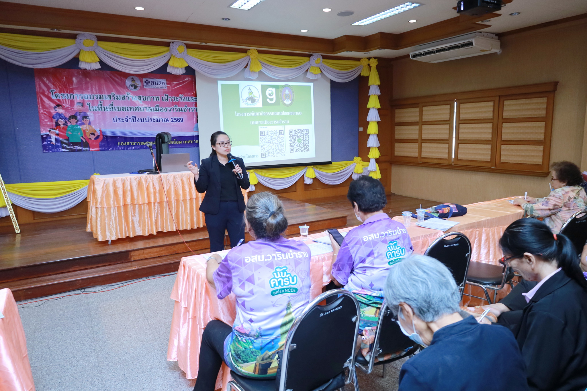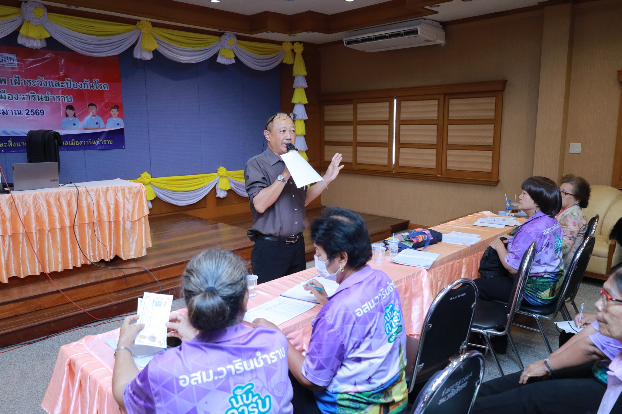 วันที่ 24 กุมภาพันธ์ 2569 เวลา 09.00 น. ณ ห้องประชุมประทุมเทพภักดี 1 งานศูนย์บริการสาธารณสุข กองสาธารณสุขและสิ่งแวดล้อม ได้จัดโครงการอบรมเสริมสร้างสุขภาพ เฝ้าระวังและป้องกันโรค ในพื้นที่เทศบาลเมืองวารินชำราบ แก่อาสาสมัครสาธารณสุข (อสม.) เทศบาลเมืองวารินชำราบ ประจำปีงบประมาณ 2569 และประชาชนทั่วไป เพื่อเป็นการให้ความรู้ในด้านการสาธารณสุข และทบทวนความรู้ด้านการส่งเสริมสุขภาพแก่คนในชุมชน รวมถึงการติดตามงานของ อสม. แต่ละชุมชน ในรอบเดือนที่ผ่านมา สำหรับการอบรมในครั้งนี้เป็นการให้ความรู้ในเรื่องการดูแลสุขภาพจิตในชุมชน โดยได้รับเกียรติจากนางรัตยา ขันติคเชนชาติ ตำแหน่งพยาบาลวิชาชีพชำนาญการ และประชาสัมพันธ์โครงการพัฒนากิจกรรมถนนปลอดขยะของเทศบาลเมืองวารินชำราบ โดยดร.คัชรินทร์ เวชชากุล อาจารย์คณะมหาวิทยาลัยราชภัฏอุบลราชธานี มาเป็นวิทยากรให้ความรู้ในครั้งนี้