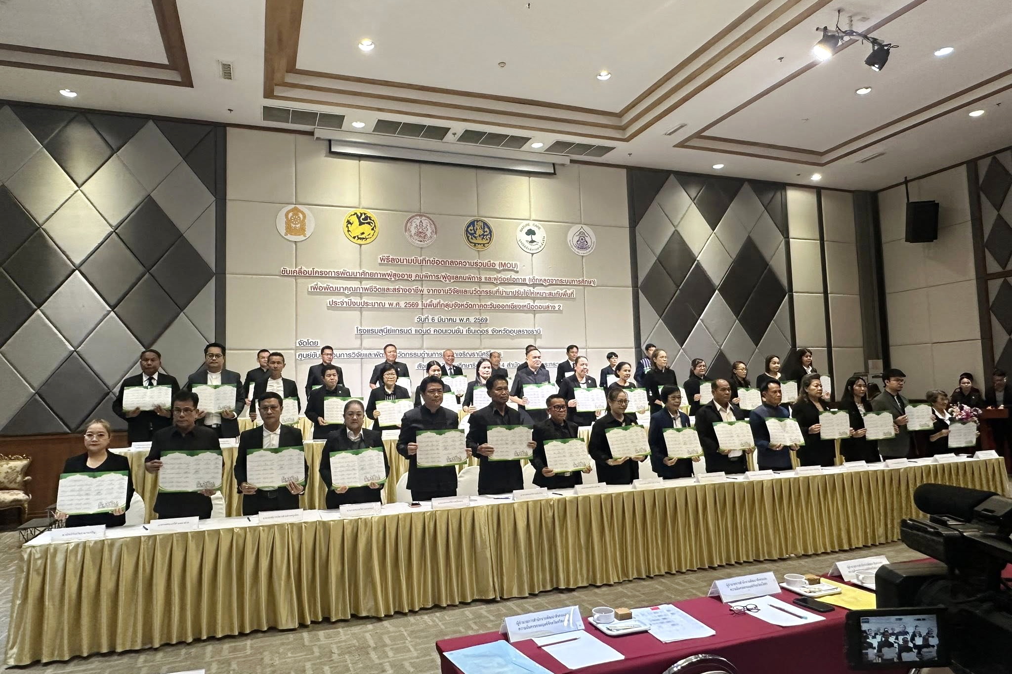 วันที่ 6 มีนาคม 2569 นายจีระชัย ไกรกังวาร นายกเทศมนตรี ได้มอบหมายให้ นายพลกิตติวัฒ เกษมศิริอนันต์ หัวหน้าฝ่ายบริหารการศึกษา กองการศึกษา เป็นตัวแทนเทศบาลเมืองวารินชำราบ เข้าร่วมในพิธีลงนามบันทึกข้อตกลงความร่วมมือ (MOU) ขับเคลื่อนโครงการพัฒนาศักยภาพผู้สูงวัย คนพิการ ผู้ดูแลคนพิการ และผู้ด้อยโอกาส (เด็กหลุดจากระบบการศึกษา) ในพื้นที่กลุ่มจังหวัดภาคตะวันออกเฉียงเหนือตอนล่าง 2 ร่วมกับสำนักงานศึกษาธิการภาค 14 จังหวัดอำนาจเจริญ จังหวัดยโสธร จังหวัดศรีสะเกษ จังหวัดอุบลราชธานี และหน่วยงานภาคีเครือข่าย รวมทั้งสิ้น 39 หน่วยงาน เพื่อยกระดับคุณภาพชีวิตและสร้างอาชีพจากงานวิจัยและนวัตกรรมที่เหมาะสมกับพื้นที่ โดยมี ว่าที่ร้อยตรีกรกฎ ประเสริฐวงษ์ รองผู้ว่าราชการจังหวัดอุบลราชธานี เป็นประธานในพิธี ณ ห้องประชุมทับทิมสยาม 5 ชั้น 5 โรงแรมสุนีย์แกรนด์ คอนเวนชั่น เซ็นเตอร์ จังหวัดอุบลราชธานี