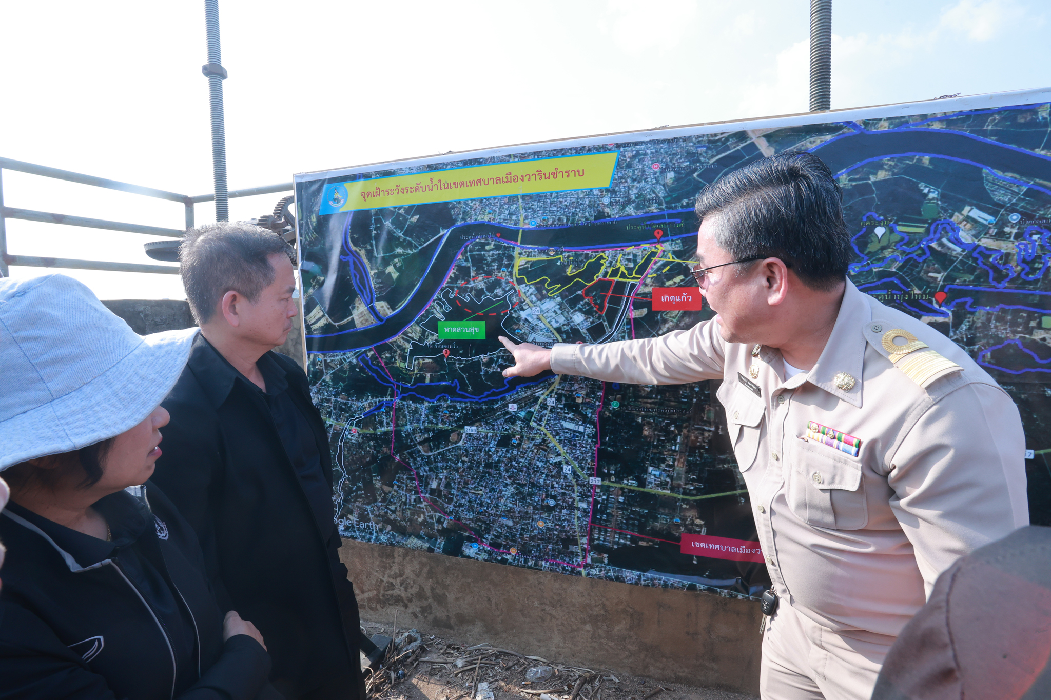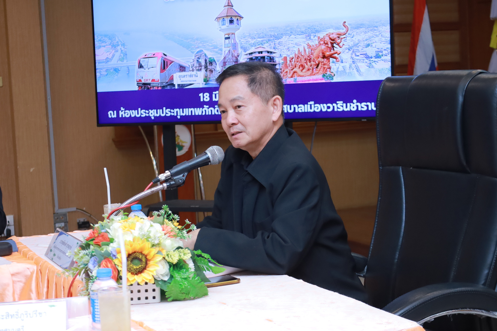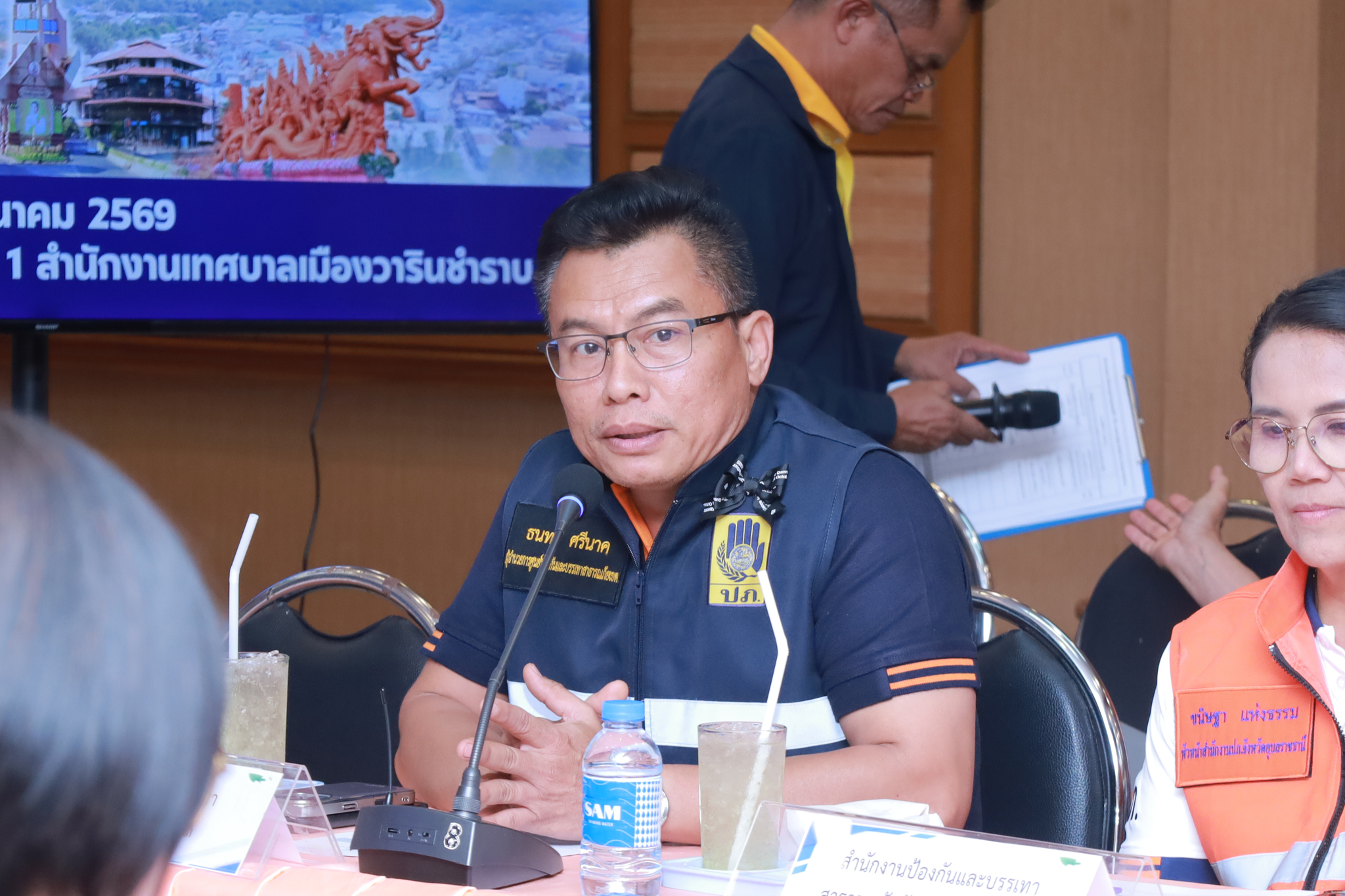 วันที่ 18 มีนาคม 2569 เวลา 13.00 น. ณ ห้องประชุมประทุมทพภักดี 1 เทศบาลเมืองวารินชำราบ นายจีระชัย ไกรกังวาร นายกเทศมนตรี ได้มอบหมายให้นายณรงชัย ประสิทธิ์ภูริปรีชา รองนายกเทศมนตรี พร้อมด้วยนายบุญยง จินตนะกุล รองนายกเทศมนตรี หัวหน้าส่วนการงาน ร่วมกับ ศูนย์ป้องกันและบรรเทาสาธารณภัยเขต 13 อุบลราชธานี สำนักงานป้องกันและบรรเทาสาธารณภัยจังหวัดอุบลราชธานี สำนักงานชลประทานที่ 7 และโครงกาชลประทานอุบลราชธานี ให้การต้อนรับคณะผู้เข้าอบรมโครงการฝึกอบรมหลักสูตรผู้ตรวจราชการระดับกรม นำโดยนายพุฒิพงศ์ สุรพฤกษ์ อดีตผู้ตรวจราชการกระทรวงทรัพยากรธรรมชาติและสิ่งแวดล้อม ลงพื้นที่ตรวจราชการแบบบูรณาการ ครั้งที่ 3 ตามโครงการอบรมหลักสูตรผู้ตรวจราชการระดับกรม ประจำปีงบประมาณ พ.ศ.2569 ลงพื้นที่ตรวจราชการแบบบูรณาการปัญหาน้ำท่วมซ้ำซาก และภัยแล้งในพื้นที่ชุมชนท่าบ้งมั่ง (วัดเสนาวงศ์) อำเภอวารินชำราบ จังหวัดอุบลราชธานี ซึ่งเป็นปัญหาที่เกิดขึ้นเป็นประจำ ส่งผลกระทบต่อคุณภาพชีวิตและเศรษฐกิจของประชาชนในพื้นที่ โดยหน่วยงานที่เกี่ยวข้องได้ร่วมกันนำเสนอแนวทางการบริหารจัดการน้ำอย่างเป็นระบบ ทั้งในระยะสั้นและระยะยาว