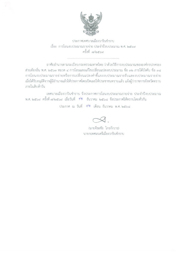 หน้าหลัก งบประมาณ: แผนการใช้จ่ายงบประมาณ การโอนงบประมาณรายจ่าย ประจำปีงบประมาณ พ.ศ.2569 ครั้งที่ 7/2569