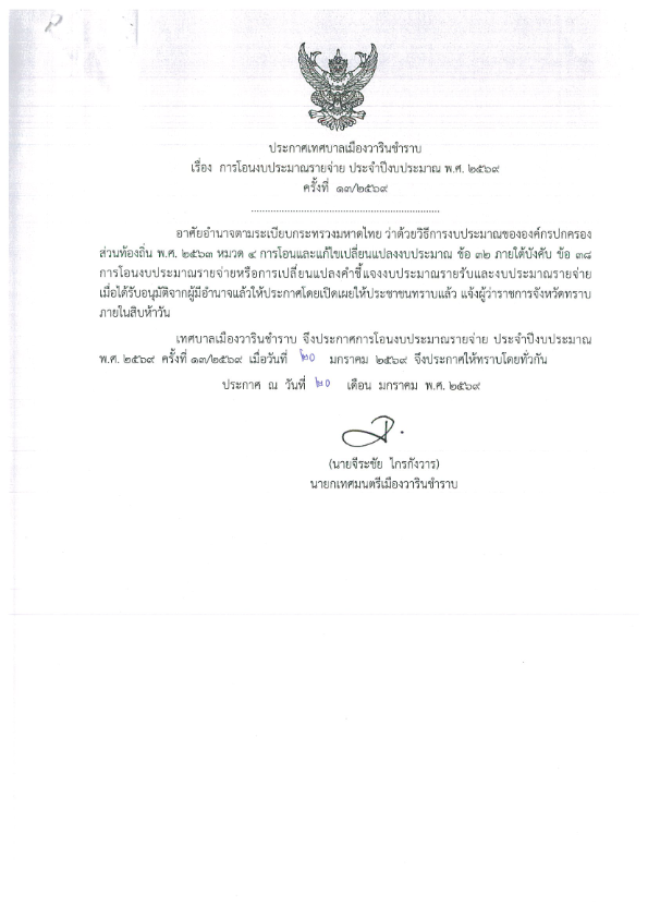 หน้าหลัก งบประมาณ: แผนการใช้จ่ายงบประมาณ การโอนงบประมาณรายจ่าย ประจำปีงบประมาณ พ.ศ.2569 ครั้งที่ 13/2569