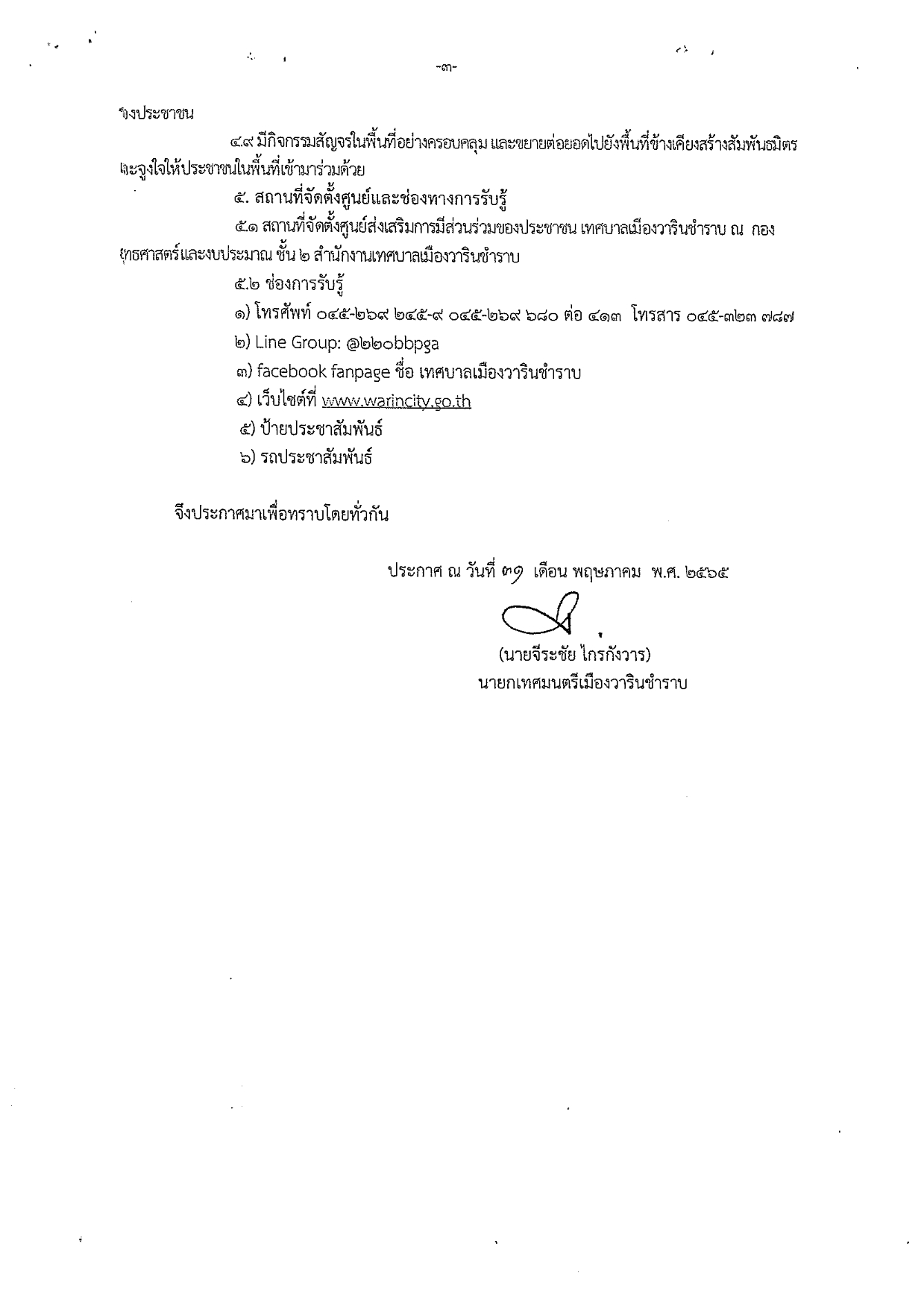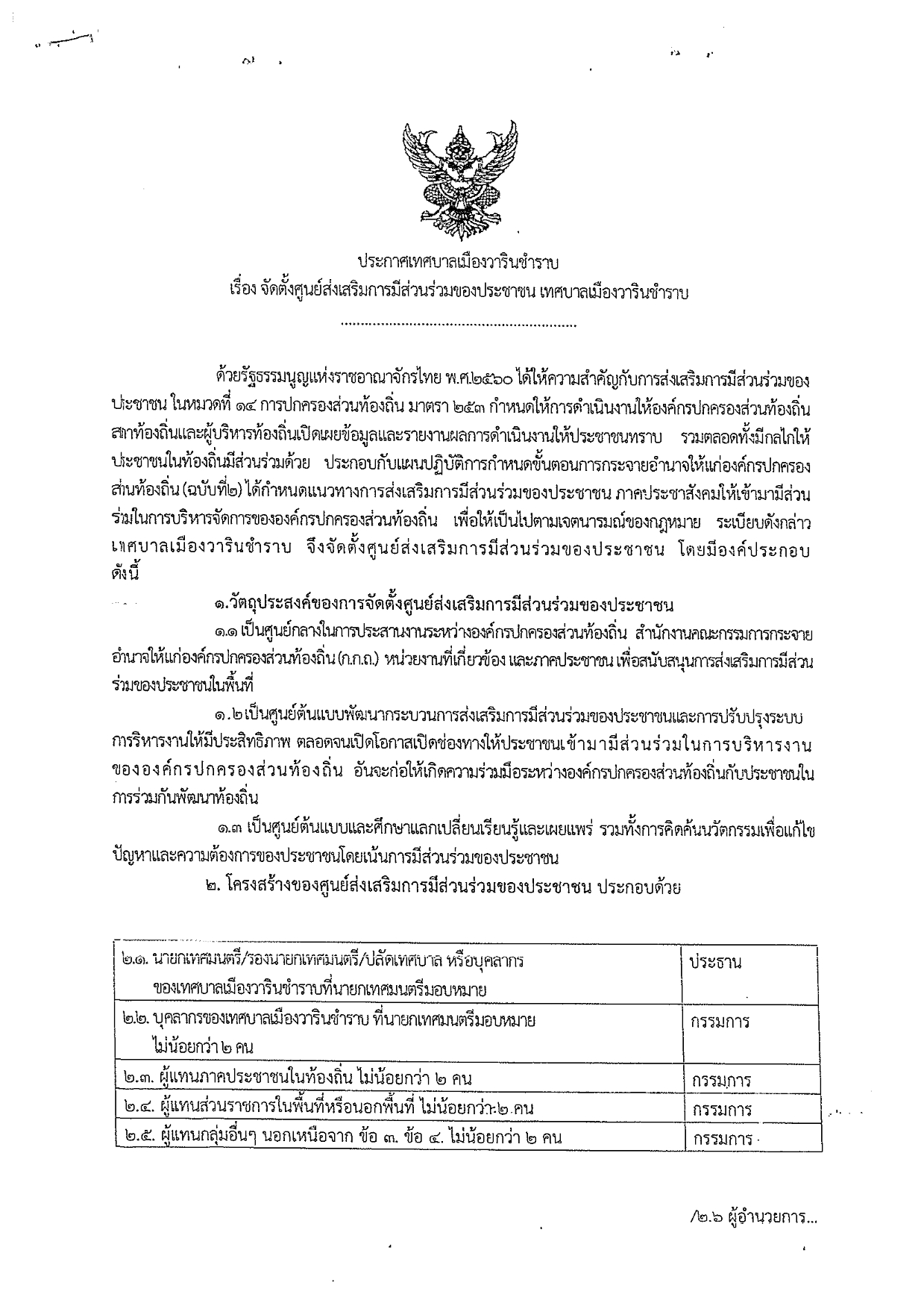 ประกาศ จัดตั้งศูนย์ส่งเสริมการมีส่วนร่วมของประชาชน เทศบาลเมืองวารินชำราบ