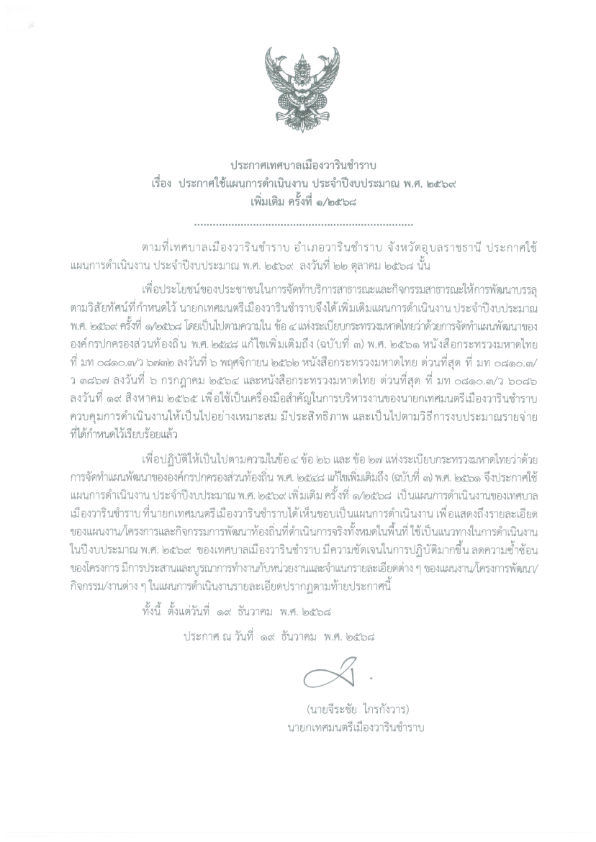 หน้าหลัก แผนพัฒนาเทศบาล: แผนการดำเนินงาน ประกาศใช้แผนการดำเนินงาน ประจำปีงบประมาณ พ.ศ.2569 เพิ่มเติม ครั้งที่ 1/2568