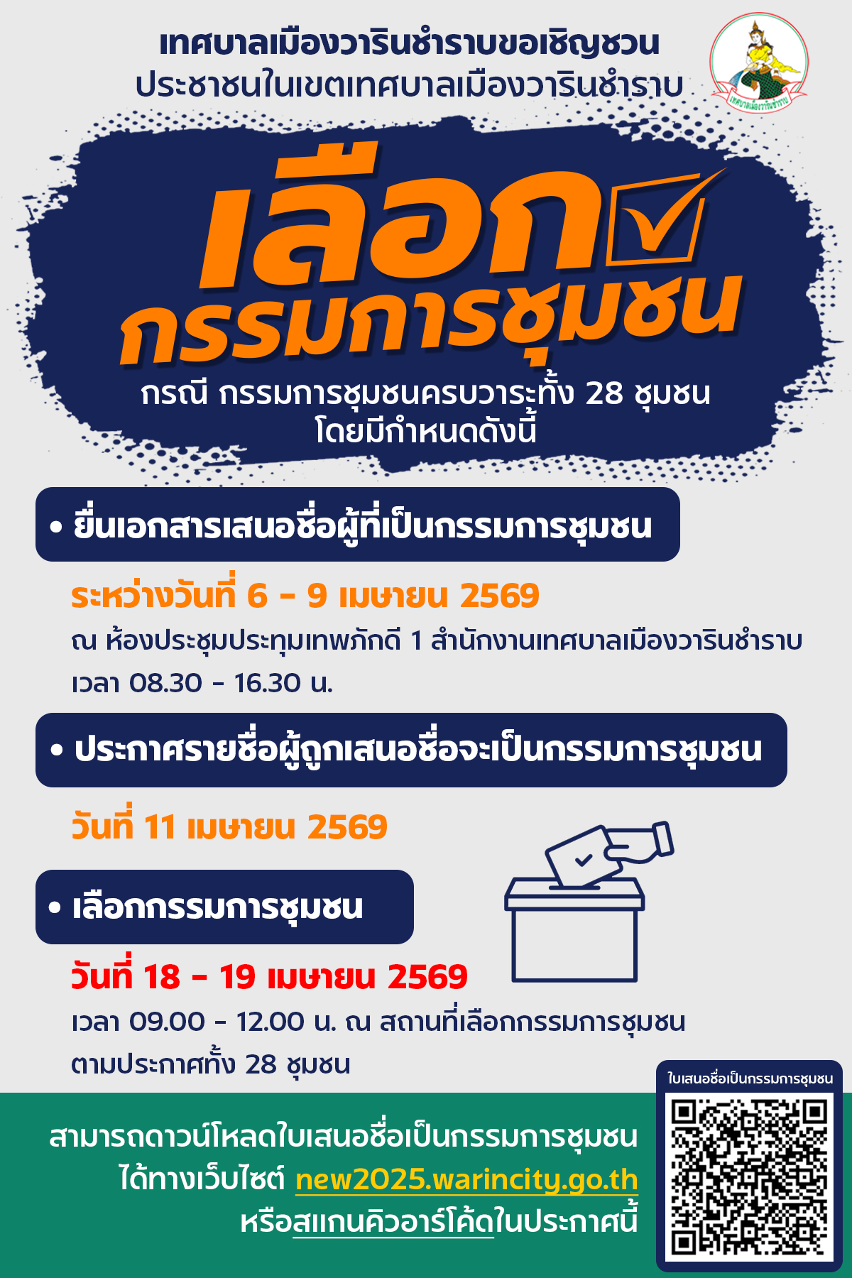 หน้าหลัก   ประชาสัมพันธ์ เทศบาลเมืองวารินชำราบ ขอเชิญชวนเลือกกรรมการชุมชนของเทศบาลเมืองวารินชำราบ
