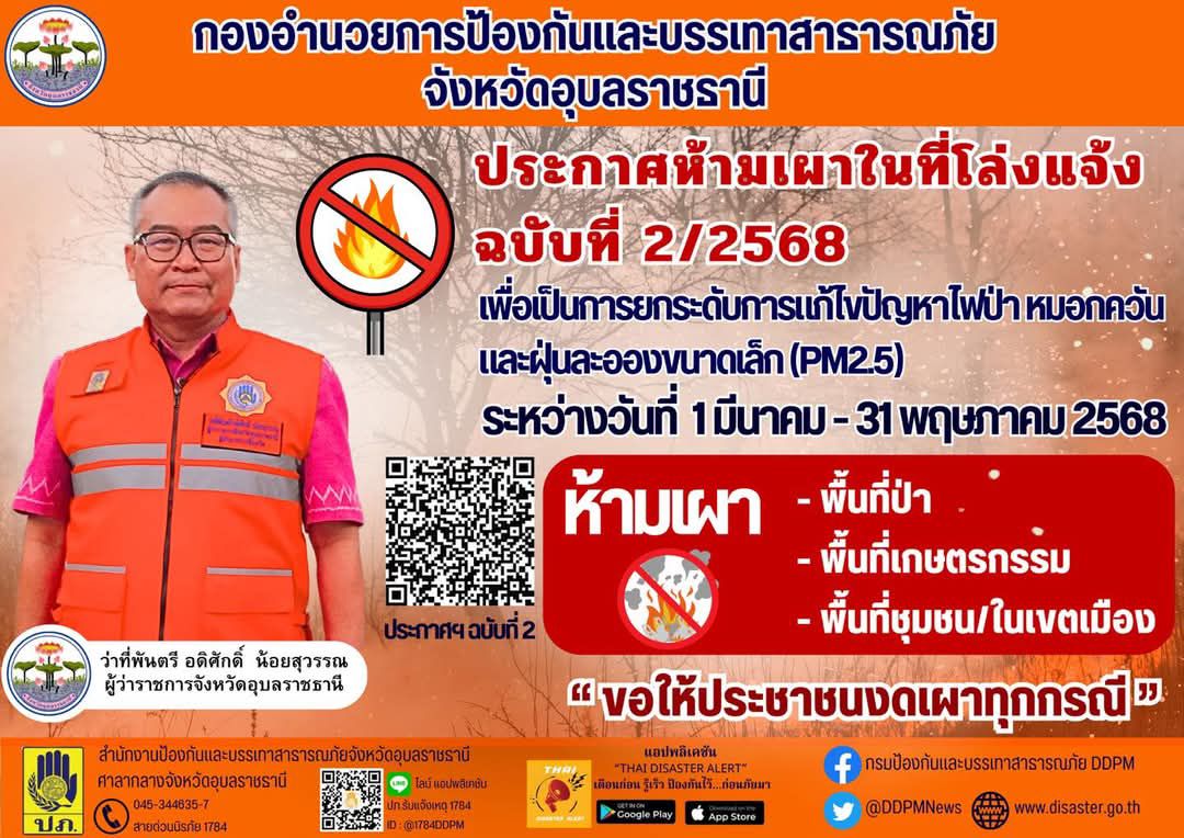 ประกาศจังหวัดอุบลราชธานี ห้ามเผา!ในที่โล่งแจ้ง ฉบับที่ 2/2568 ระหว่างวันที่ 1 มีนาคม - 31 พฤษภาคม 2568