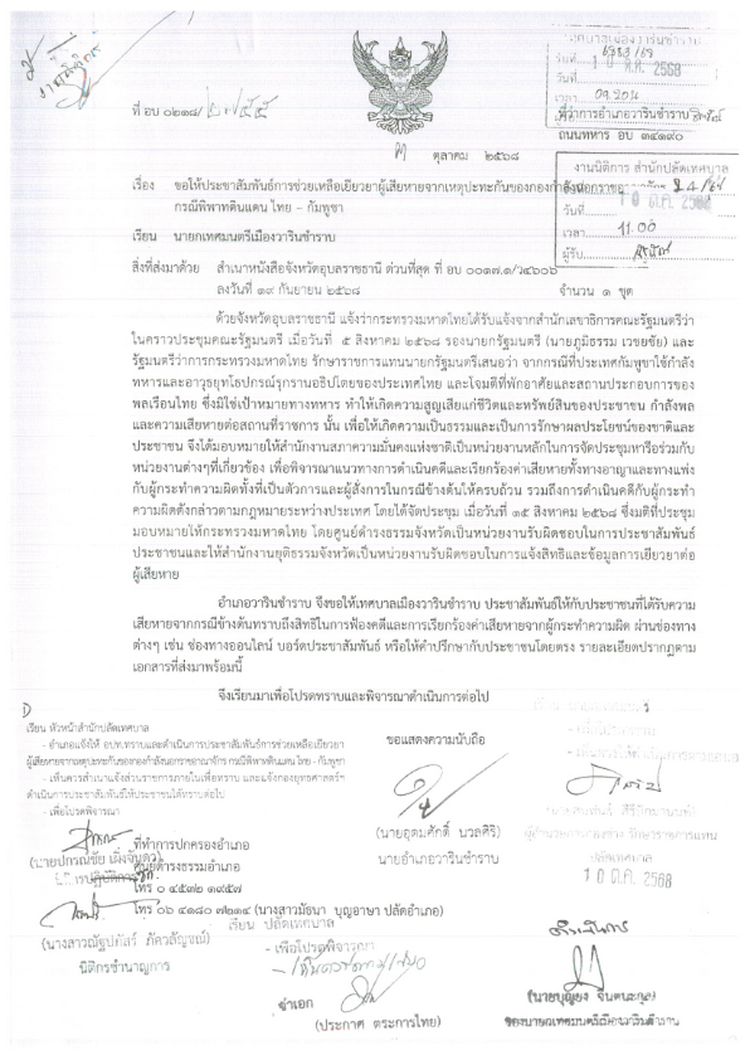 ประชาสัมพันธ์การช่วยเหลือเยียวยาผู้เสียหายจากการปะทะกันของกองกำลังนอกราชอาณาจักร กรณีพิพาทดินแดน ไทย-กัมพูชา