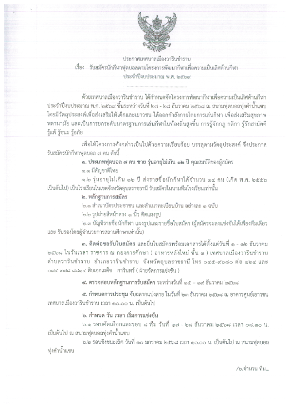 รับสมัครนักกีฬาฟุตบอลตามโครงการพัฒนากีฬาเพื่อความเป็นเลิศด้านนักกีฬา ประจำปีงบประมาณ พ.ศ.2569