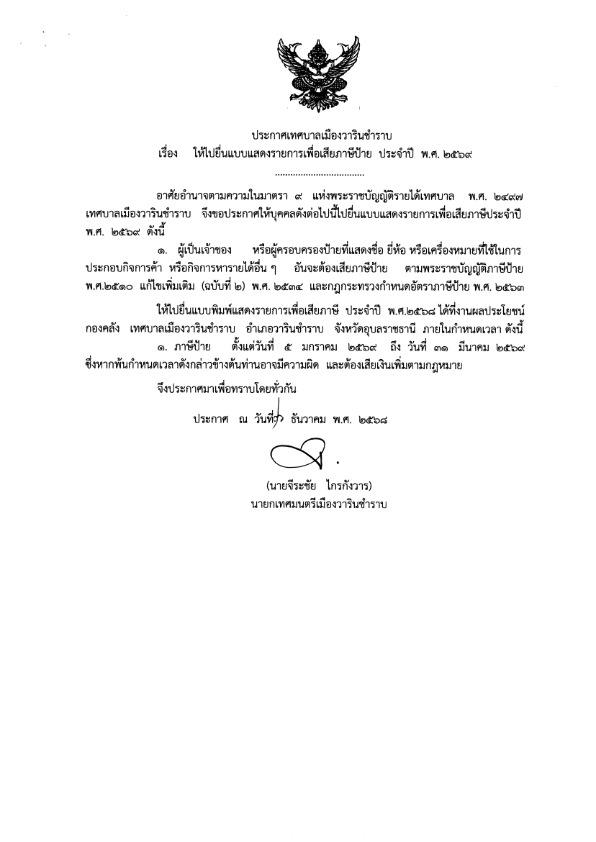 หน้าหลัก   ภาษีที่ดินและสิ่งปลูกสร้าง ให้ไปยื่นแบบแสดงรายการเพื่อเสียภาษีป้าย ประจำปี พ.ศ.2569