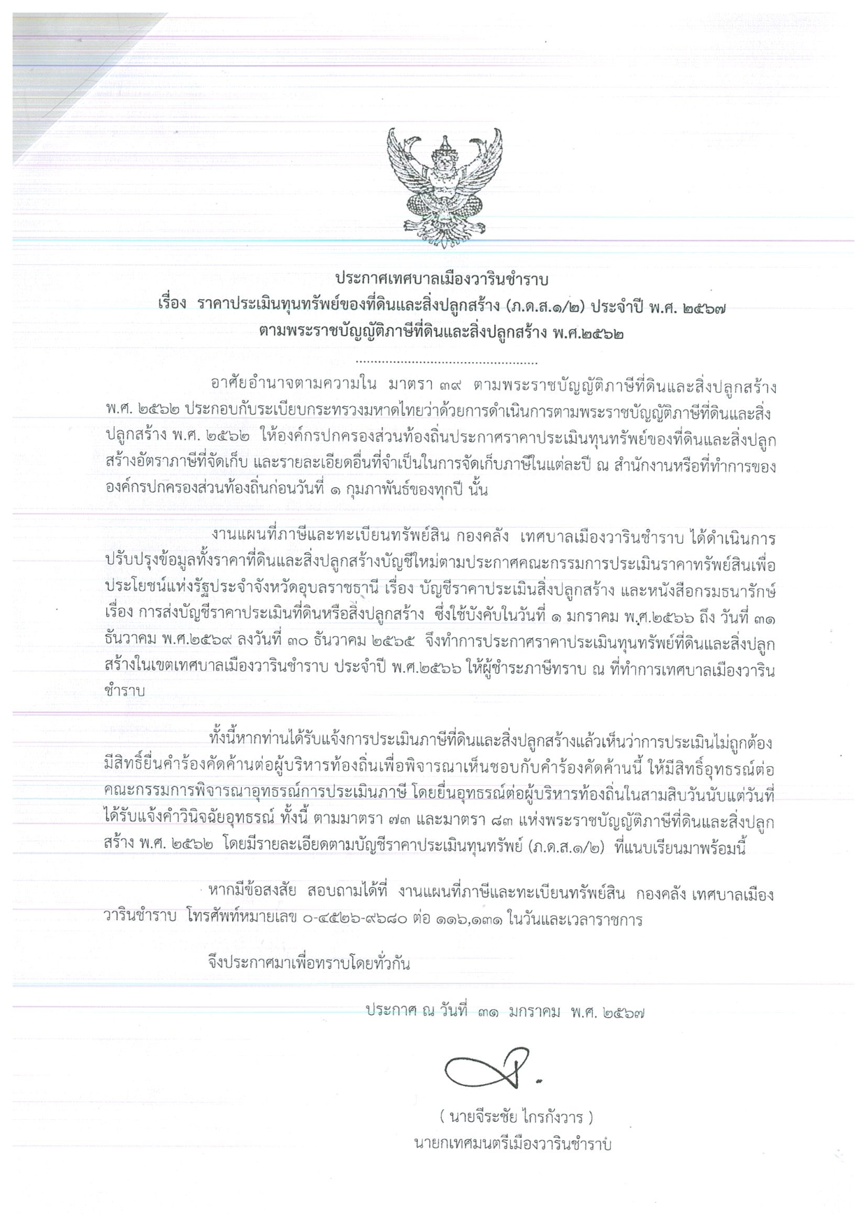 ประกาศเทศบาลเมืองวารินชำราบ เรื่อง ราคาประเมินทุนทรัพย์ของที่ดินและสิ่งปลูกสร้าง (ภ.ด.ส.1/2) ประจำปี 2567 ตามพรบ.ภาษีที่ดินและสิ่งปลูกสร้าง พ.ศ. 2562