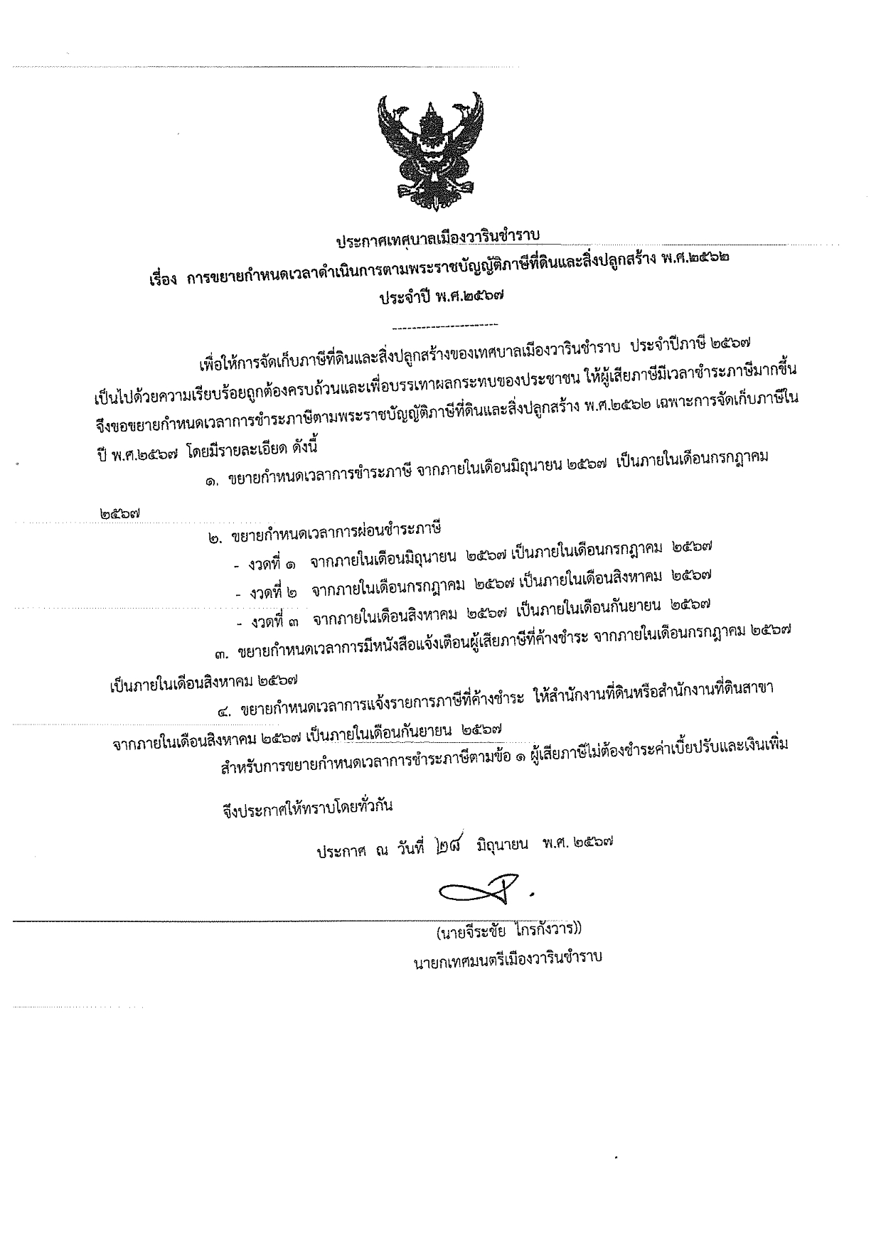 ประกาศเทศบาลเมืองวารินชำราบ เรื่อง การขยายกำหนดเวลาดำเนินการตาม พรบ.ภาษีที่ดินและสิ่งปลูกสร้าง พ.ศ. 2562 ประจำปี 2567