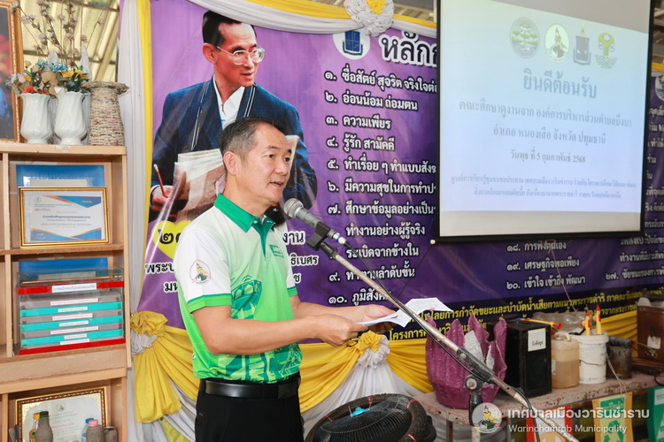วันที่ 5 กุมภาพันธ์ 2568 เวลา 14.00 น. ณ ศูนย์เรียนรู้เพื่อการจัดการสิ่งแวดล้อม ชุมชนชลประทาน นายจีระชัย ไกรกังวาร นายกเทศมนตรี ได้มอบหมายให้ นายบุญยง จินตนะกุล รองนายกเทศมนตรี พร้อมด้วย หัวหน้าส่วนการงาน และเจ้าหน้าที่เทศบาลเมืองวารินชำราบ ร่วมด้วย คณะทำงานศูนย์การเรียนรู้ฯ ชุมชนชลประทาน และนายรชต ศุภโกศล นักพัฒนาธุรกิจยูนี่จังหวัดอุบลราชธานี ให้การต้อนรับคณะผู้บริหาร สมาชิกสภาเทศบาล หัวหน้าส่วนการงาน และเจ้าหน้าที่ จากองค์การบริหารส่วนตำบลบึงบา อำเภอหนองเสือ จังหวัดปทุมธานี นำโดย ดร.วิสานท์ แสวงหา เลขานุการนายกองค์การบริหารส่วนตำบลบึงบา ได้นำผู้นำชุมชนเข้าศึกษาดูงานด้านการบริหารจัดการขยะในชุมชนชลประทาน ซึ่งเป็นชุมชนในเขตเทศบาลเมืองวารินชำราบที่ประสบความสำเร็จในการลดปริมาณขยะภายในชุมชน โดยเป็นชุมชนต้นแบบภายใต้โครงการชุมชนปลอดขยะ Zero Waste ด้วยการนำขยะมารีไซเคิลผลิตเป็นสิ่งของเครื่องใช้ต่างๆ อาทิ ถังขยะลดโลกร้อน,ไม้กวาดจากขวดพลาสติก, เสื่อจากถุงพลาสติก, ผ้ากันเปื้อนจากป้ายไวนิล, เตาชีวมวลจากหม้อหุงข้าวที่ไม่ใช้แล้ว เป็นต้น ซึ่งช่วยลดปริมาณขยะในชุมชนที่จะต้องนำไปกำจัดต่อไป