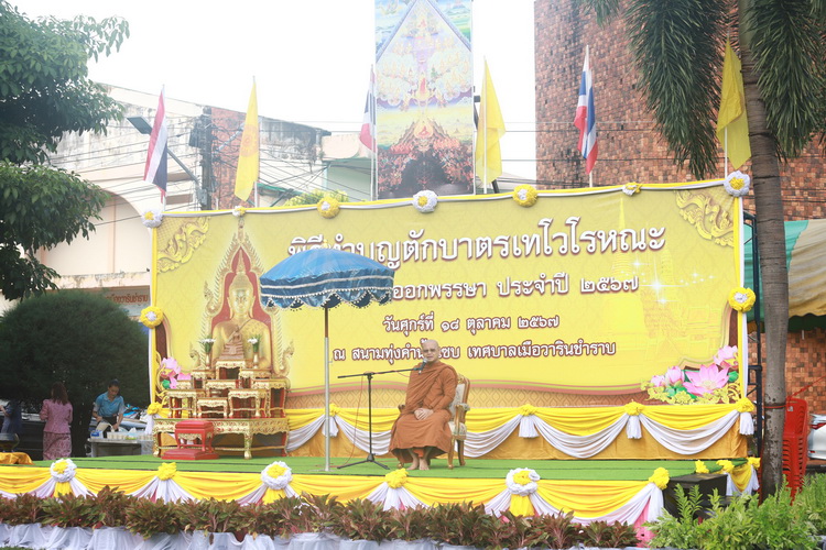 วันที่ 18 ตุลาคม 2567 เวลา 07.00 น. ณ สนามทุ่งคำน้ำแซบ นายจีระชัย ไกรกังวาร นายกเทศมนตรี พร้อมด้วยคณะผู้บริหาร สมาชิกสภาเทศบาล, หัวหน้าส่วนราชการ, พนักงานเทศบาล ร่วมกับประชาชนชาวเมืองวารินชำราบ ทำบุญตักบาตรเทโวโรหณะเนื่องในวันออกพรรษา ประจำปี 2567 โดยได้นิมนต์พระสงฆ์และสามเณรจากวัดต่างๆในเขตอำเภอวารินชำราบมารับบิณฑบาต เพื่อเป็นการรำลึกถึงวันที่องค์สมเด็จพระสัมมาสัมพุทธเจ้าเสด็จลงจากสวรรค์ชั้นดาวดึงส์ หลังจากได้ขึ้นไปจำพรรษาโปรดพุทธมารดาในวันแรม 1 ค่ำ เดือน 11 ซึ่งตรงกับหลังวันปราวารณาออกพรรษาเป็นเวลา 1 วัน พร้อมกันนี้ได้กราบนมัสการพระครูธีรปัญญาภรณ์ รองเจ้าคณะจังหวัดอุบลราชธานี (ธรรมยุต) เจ้าอาวาสวัดแสนสำราญ ประธานฝ่ายสงฆ์ กล่าวสัมโมทนียกถาฯ เทศนาสั่งสอนแก่ประชาชน ผู้มาร่วมทำบุญทุกคนเพื่อเป็นข้อคิดเตือนใจในการดำเนินชีวิต