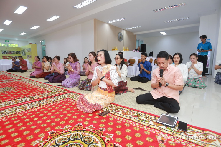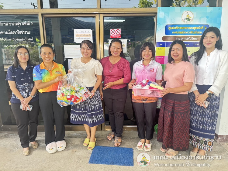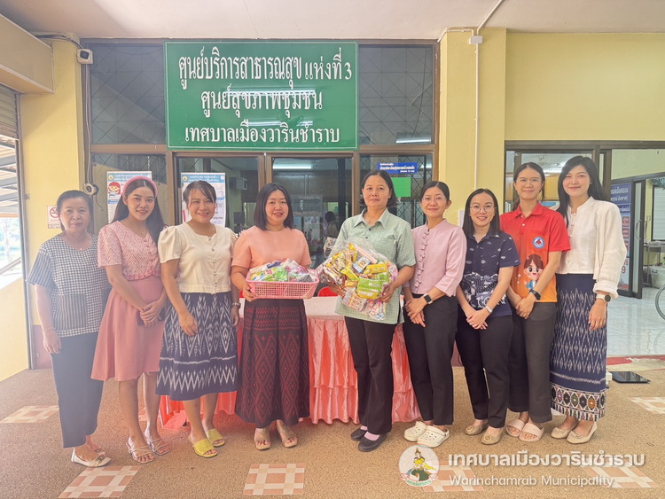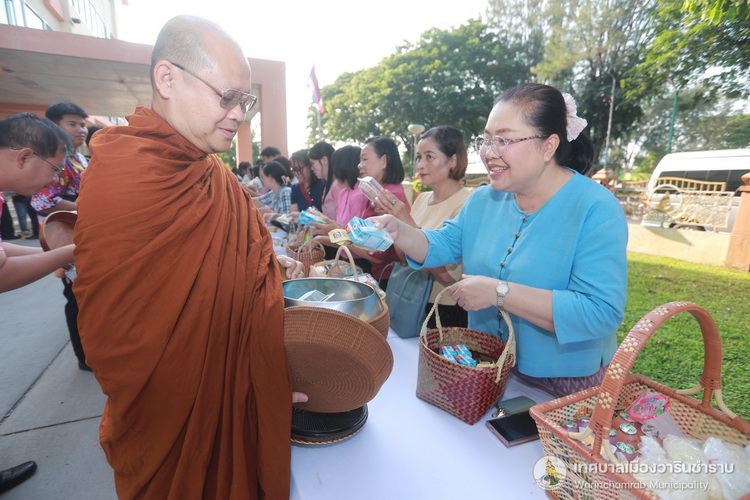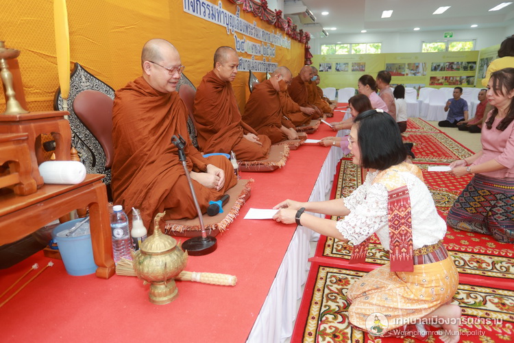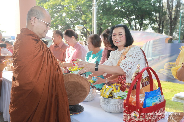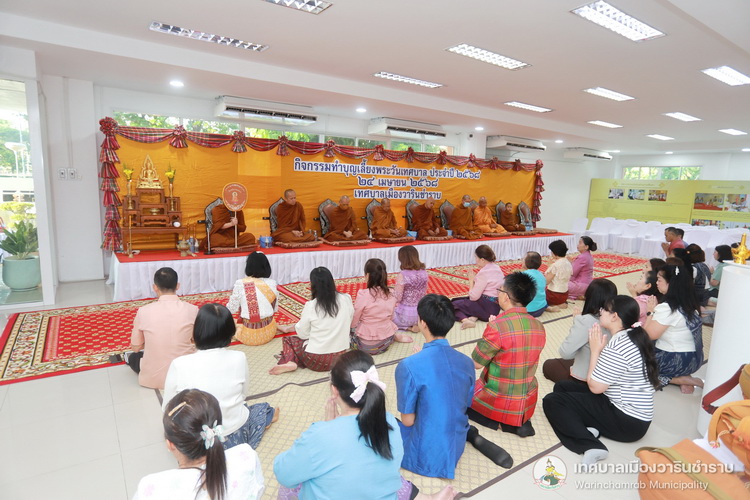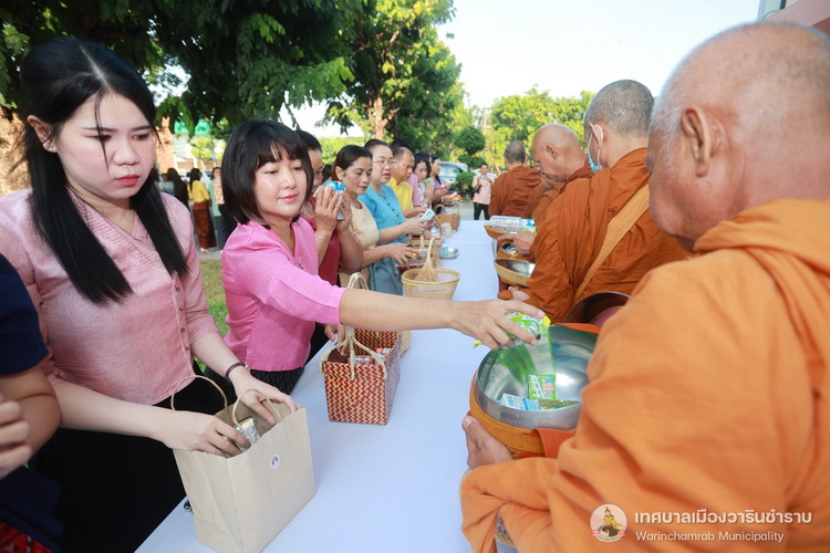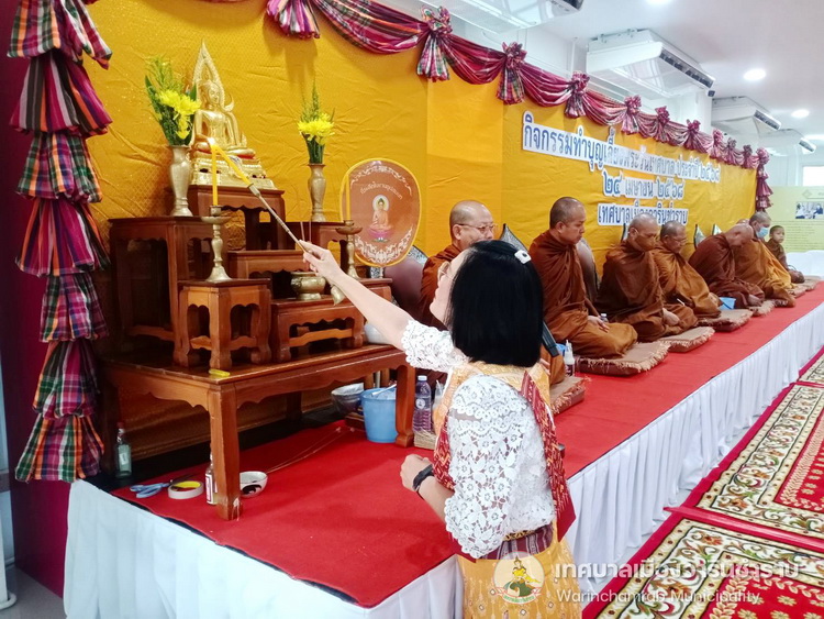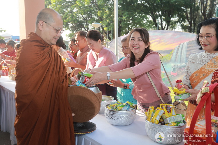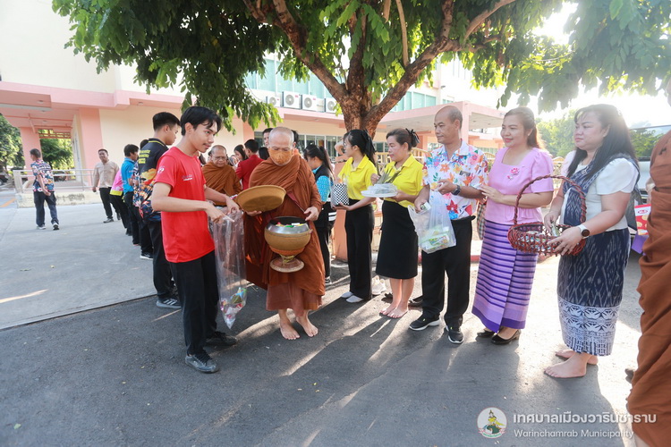 วันที่ 24 เมษายน 2568 เวลา 07.00 น. นางรุ่งนภา ทับหนองฮี รองปลัดเทศบาล รักษาราชการแทนปลัดเทศบาล ปฏิบัติหน้าที่นายกเทศมนตรีเมืองวารินชำราบ นำหัวหน้าส่วนราชการ พนักงานเทศบาล ผู้อำนวยการสถานศึกษา และพนักงานครูเทศบาลโรงเรียนในสังกัดเทศบาลเมืองวารินชำราบทั้ง 3 แห่ง ร่วมพิธีทำบุญตักบาตร พระสงฆ์ 8 รูป เนื่องในวันเทศบาล ประจำปี 2568 เพื่อความสิริมงคลแก่ตนเองและครอบครัว จากนั้นได้นำข้าวสารอาหารแห้งส่งมอบ ให้แก่ศูนย์บริการสาธารณสุขทั้ง 3 แห่ง เพื่อมอบให้ผู้ป่วยติดเตียง ต่อไป