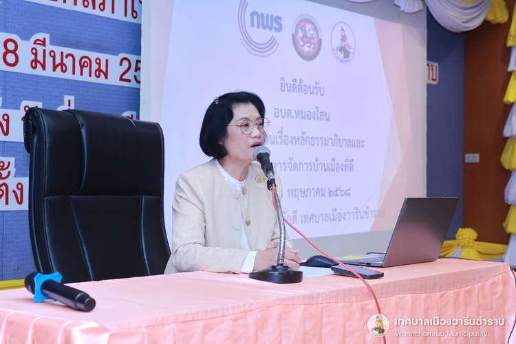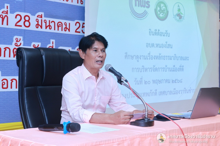 วันที่ 21 พฤษภาคม 2568 เวลา 13.00 น. นางรุ่งนภา ทับหนองฮี รองปลัดเทศบาล รักษาราชการแทน ปลัดเทศบาล ปฏิบัติหน้าที่นายกเทศมนตรีเมืองวารินชำราบ พร้อมด้วยหัวหน้าส่วนการงานเทศบาลเมืองวารินชำราบ ให้การต้อนรับ คณะผู้บริหาร และเจ้าหน้าที่จากองค์การบริหารส่วนตำบลหนองโสน อำเภอเมืองเพชรบุรี จังหวัดเพชรบุรี นำโดย นายยุทธนา เมืองเล็ก นายกองค์การบริหารส่วนตำบลหนองโสน ในการเข้าศึกษาดูงานด้านการบริหารจัดการที่ดีของเทศบาลเมืองวารินชำราบ เพื่อเป็นการแลกเปลี่ยนประสบการณ์ และแนวทางในพัฒนาการปฏิบัติงานให้มีประสิทธิภาพมากขึ้น ซึ่งในการบรรยายได้รับเกียรติจาก นางรุ่งนภา ทับหนองฮี หัวหน้าสำนักปลัดเทศบาล รักษาราชการแทนปลัดเทศบาล เป็นวิทยากร ทั้งนี้ในปี 2567 ที่ผ่านมา เทศบาลเมืองวารินชำราบ ได้เข้าร่วมการประกวดองค์กรปกครองส่วนท้องถิ่นที่มีการบริหารจัดการที่ดี ประจำปีงบประมาณ พ.ศ. 2567 โดยสามารถเข้าสู่รอบการประเมินในรอบสุดท้าย