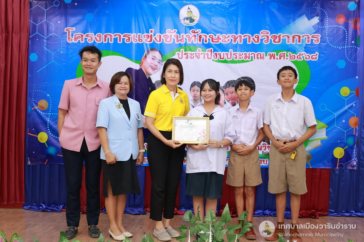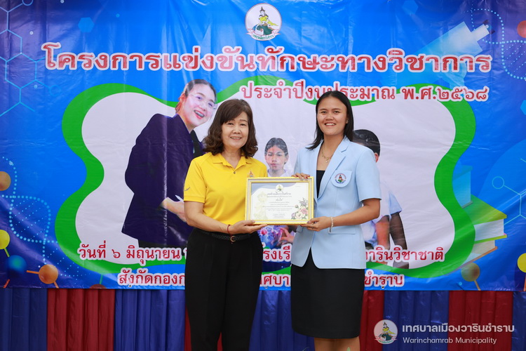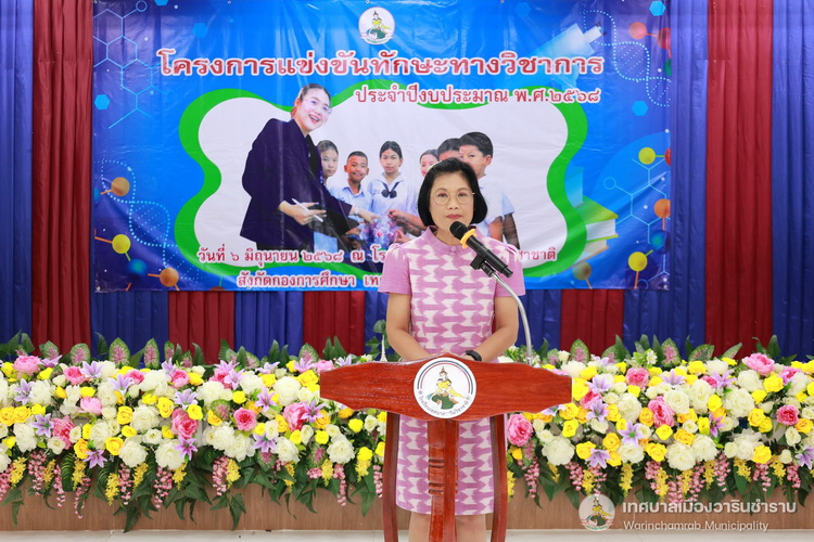 วันที่ 6 มิถุนายน 2568 ณ โรงเรียนเทศบาลวารินวิชาชาติ กองการศึกษา เทศบาลเมืองวารินชำราบ ได้จัดทำโครงการแข่งขันทักษะทางวิชาการ ประจำปี 2568 เพื่อแข่งขันคัดเลือกพนักงานครูเทศบาลสถานศึกษาในสังกัดกลุ่มสาระการเรียนรู้และกลุ่มปฐมวัยเป็นตัวแทนระดับเทศบาล เข้าร่วมการแข่งขันทักษะทางวิชาการภาคตะวันออกเฉียงเหนือ เพื่อส่งเสริมให้นักเรียนและครูได้พัฒนาศักยภาพทางวิชาการ แสดงความรู้ ความสามารถ และความคิดสร้างสรรค์ โดยนางรุ่งนภา ทับหนองฮี รองปลัดเทศบาล รักษาราชการแทนปลัดเทศบาล ปฏิบัติหน้าที่นายกเทศมนตรีเมืองวารินชำราบ เป็นประธานพร้อมได้กล่าวให้โอวาทแก่ตัวแทนนักเรียนและคณะครูเพื่อเป็นขวัญและกำลังใจ เข้าร่วมการแข่งขันทักษะวิชาการ ระดับภาคตะวันออกเฉียงเหนือที่จังหวัดร้อยเอ็ด ระหว่างวันที่ 23-25 กรกฎาคม 2568 ต่อไป
