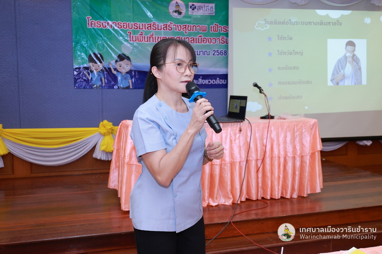 วันที่ 30 มิถุนายน 2568 เวลา 09.00 น. ณ ห้องประชุมประทุมเทพภักดี 1 งานศูนย์บริการสาธารณสุข กองสาธารณสุขและสิ่งแวดล้อม ได้จัดโครงการอบรมเสริมสร้างสุขภาพ เฝ้าระวังและป้องกันโรค ในพื้นที่เทศบาลเมืองวารินชำราบ แก่อาสาสมัครสาธารณสุข (อสม.) เทศบาลเมืองวารินชำราบ และประชาชนทั่วไป ประจำเดือนมิถุนายน 2568 เพื่อเป็นการให้ความรู้ในด้านการสาธารณสุข และทบทวนความรู้ด้านการส่งเสริมสุขภาพแก่คนในชุมชน รวมถึงการติดตามงานของ อสม. แต่ละชุมชน ในรอบเดือนที่ผ่านมา สำหรับการอบรมในครั้งนี้เป็นการให้ความรู้ในเรื่องของโรคที่มากับฤดูฝน โดยนางรัตยา ขันติคเชนชาติ พยาบาลวิชาชีพชำนาญการ จากโรงพยาบาลส่งเสริมสุขภาพตำบลเพียเภ้า มาเป็นวิทยากรให้ความรู้ในครั้งนี้