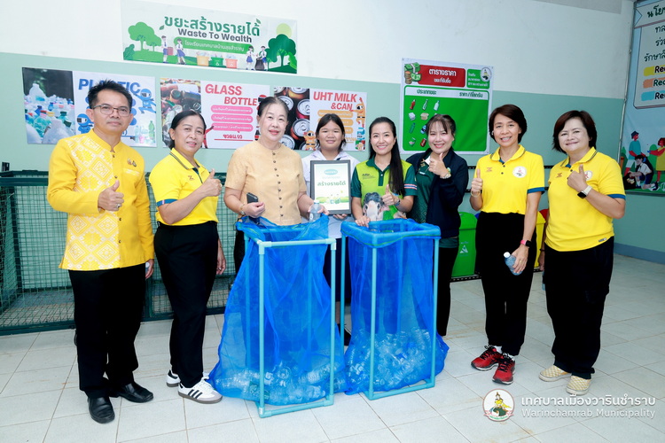 วันที่ 2 กรกฎาคม 2568 เวลา 09.00 น. นางพฤกษา ตั้งกิจวนิชกุล ผู้อำนวยการกองสาธารณสุข ฯ พร้อมด้วย เจ้าหน้าที่กองสาธารณสุขและสิ่งแวดล้อม เทศบาลเมืองวารินชำราบ ได้ลงพื้นที่ติดตามแนวทางการดำเนินงานธนาคารขยะของโรงเรียนเทศบาลบ้านสุขสำราญ ตามนโยบายการจัดตั้งธนาคารขยะในสถานศึกษาสังกัดขององค์กรปกครองส่วนท้องถิ่น (School Recyclable Waste Bank) ประจำปีงบประมาณ 2568 ของกรมส่งเสริมการปกครองส่วนท้องถิ่น ในการส่งเสริมให้เกิดการคัดแยกขยะต้นทาง สร้างจิตสำนึกในการคัดแยกขยะ ช่วยลดปริมาณขยะที่เกิดขึ้นภายในสถานศึกษาและชุมชน รวมถึงการเสริมสร้างองค์ความรู้ในการคัดแยกขยะรีไซเคิลที่ถูกต้องแก่นักเรียน รวมทั้งยังเป้นการขับเคลื่อนตามนโยบายของกระทรวงมหาดไทย ด้านที่ 3 การสร้างอาชีพ เพิ่มรายได้ให้กับประชาชน โดยมี ดร.ขวัญพธู อัครจันทร์ ผู้อำนวยการโรงเรียนเทศบาลบ้านสุขสำราญ พร้อมด้วย คณะครู ให้การต้อนรับ และพาเยี่ยมชมการดำเนินงานต่าง ๆ ในการคัดแยกขยะ และลดปริมาณขยะภายในโรงเรียน ด้วยแนวคิด 3Rs และหลัก 7R