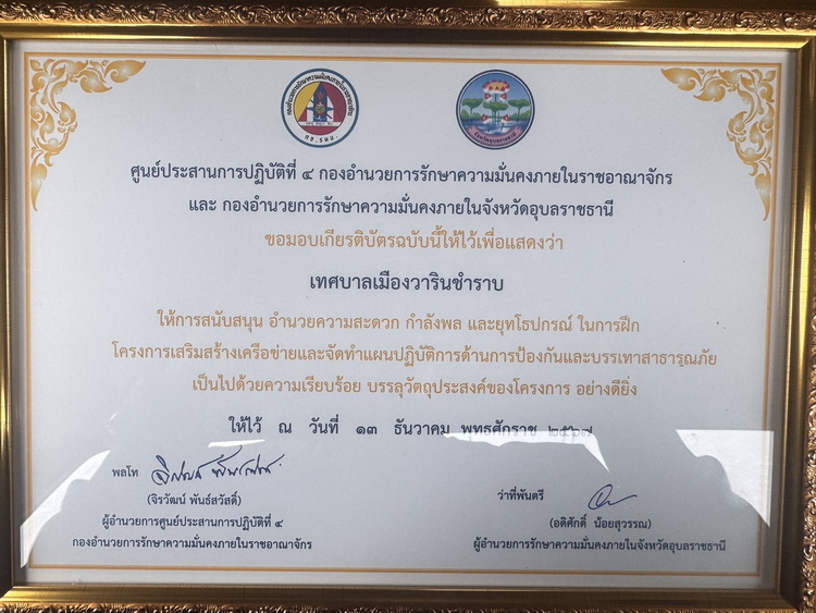 พร้อมกันนี้ เทศบาลเมืองวารินชำราบ ยังได้รับร่วมการฝึกโครงการเสริมสร้างเครือข่ายและจัดทำแผนปฏิบัติการด้านการป้องกันและบรรเทาสาธารณภัย ประจำงบประมาณ 2568 โดย ศูนย์ประสานการปฏิบัติที่ 4 กองอำนวยการรักษาความมั่นคงภายในราชอาณาจักร และกองอำนวยการรักษาความมั่นคงภายในจังหวัดอุบลราชธานี เพื่อเป็นการเตรียมความพร้อมและเพิ่มทักษะของกำลังพลของแต่ละหน่วยในการใช้เครื่องจักรสาธารณภัย ตลอดจนเครื่องมือ/อุปกรณ์ต่างๆ หากมีสถานการณ์สาธารณภัยเกิดขึ้น ก็สามารถที่จะประสานบูรณาการสนธิกำลังออกปฏิบัติการช่วยเหลือประชาชนผู้ประสบสาธารณภัยได้อย่างรวดเร็ว ทั่วถึง และเป็นธรรม สามารถลดความสูญเสียทั้งด้านชีวิตและทรัพย์สิน ได้อย่างมีประสิทธิภาพต่อไป