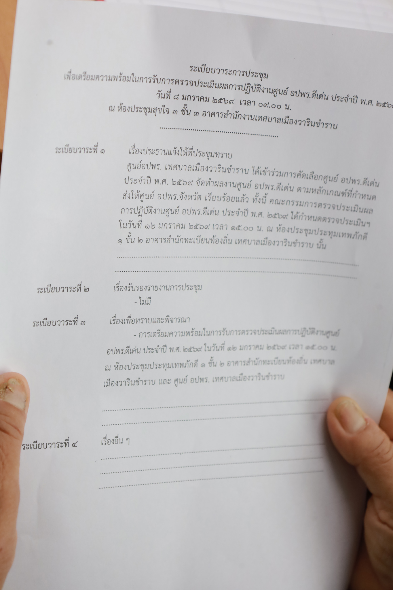วันที่ 8 มกราคม 2569 เวลา 10.00 น. จ่าเอกประกาศ ตระการไทย หัวหน้าสำนักปลัดเทศบาล พร้อมด้วย เจ้าหน้าที่งานป้องกันและบรรเทาสาธารณภัย และสมาชิก อปพร. เทศบาลเมืองวารินชำราบ ร่วมประชุมเพื่อเตรียมความพร้อมในการรับการตรวจประเมินผลการปฏิบัติงานศูนย์ อปพร. ดีเด่น ประจำปี 2569 ณ ห้องประชุมสุขใจ 2 อาคารใหม่สำนักงานเทศบาลเมืองวารินชำราบ ทั้งนี้ ศูนย์ อปพร. เทศบาลเมืองวารินชำราบ ได้เข้าร่วมการคัดเลือกศูนย์ อปพร. ดีเด่น ประจำปี พ.ศ. 2569 ซึ่งศูนย์ อปพร. เขต 13 อุบลราชธานี ในฐานะคณะกรรมการตรวจประเมิน จึงได้กำหนดวันลงพื้นที่ตรวจเยี่ยมและประเมินผลการดำเนินงานของศูนย์ อปพร. ที่เสนอชื่อเข้ารับการคัดเลือกศูนย์ อปพร. ดีเด่น โดย ศูนย์ อปพร. เทศบาลเมืองวารินชำราบ จะรับการตรวจประเมินในวันที่ 12 มกราคม 2569 เวลา 15.00 น.