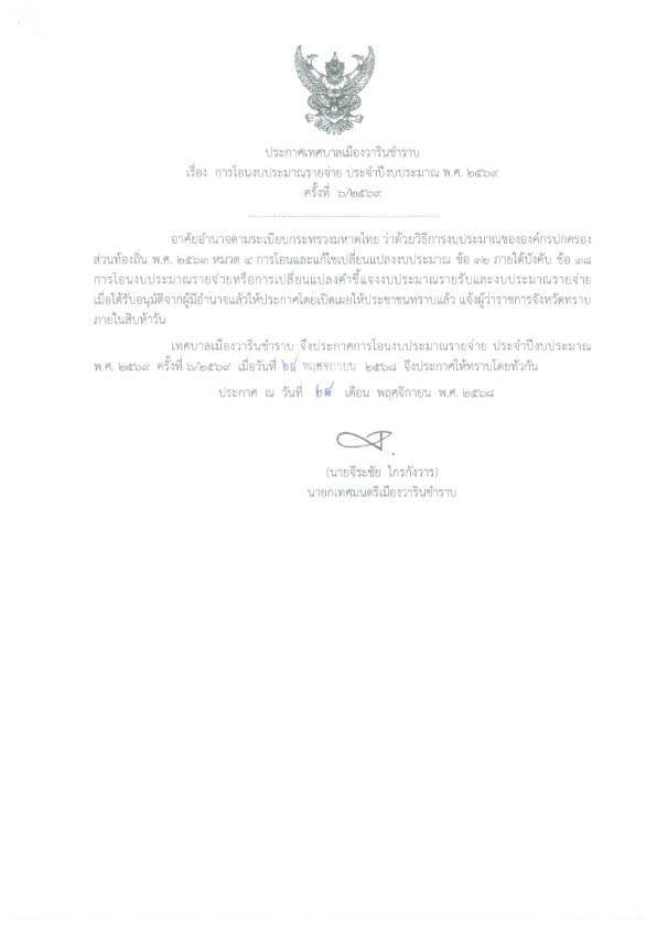 หน้าหลัก งบประมาณ: แผนการใช้จ่ายงบประมาณ การโอนงบประมาณรายจ่าย ประจำปีงบประมาณ พ.ศ.2569 ครั้งที่ 6/2569