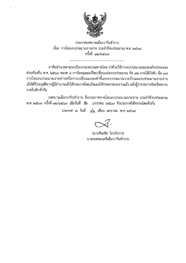 หน้าหลัก งบประมาณ: แผนการใช้จ่ายงบประมาณ การโอนงบประมาณรายจ่าย ประจำปีงบประมาณ พ.ศ.2569 ครั้งที่ 12/2569