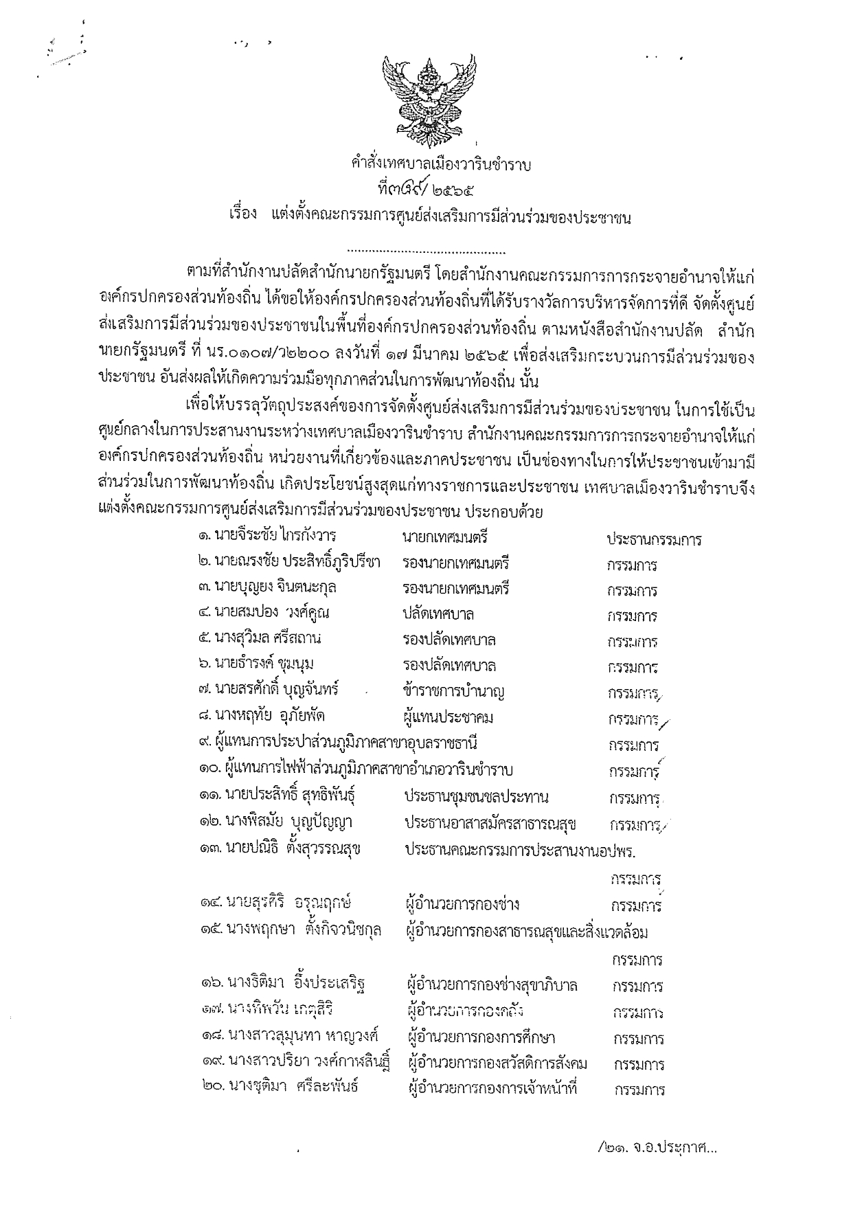 รายงานการประชุมคณะกรรมการศูนย์ส่งเสริมการมีส่วนร่วมของประชาชนเทศบาลเมืองวารินชำราบ