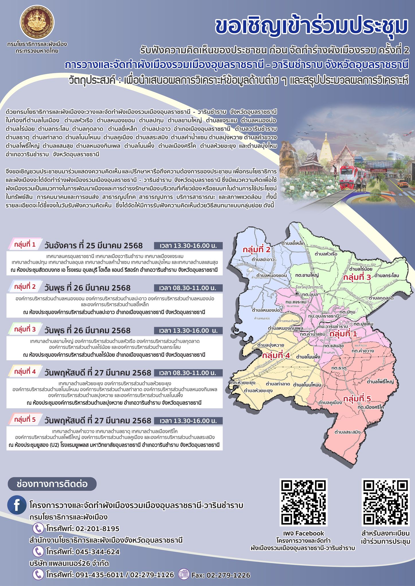 หน้าหลัก   ประชาสัมพันธ์ ขอเชิญเข้าร่วมประชุมรับฟังความคิดเห็นของประชาชนก่อนจัดทำร่างผังเมืองรวม ครั้งที่ 2 โครงการวางและจัดทำผังเมืองรวมเมืองอุบลราชธานี-วารินชำราบ
