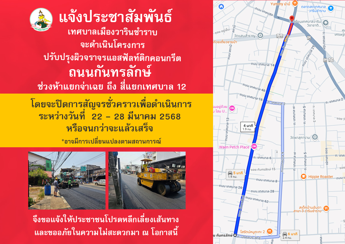 หน้าหลัก   ประชาสัมพันธ์ ปิดการสัญจรถนนกันทรลักษ์เพื่อดำเนินการปรับปรุงผิวจราจรแอสฟัลท์ติกคอนกรีต จากห้าแยกจ่าเฉย ถึง สี่แยกเทศบาล 12