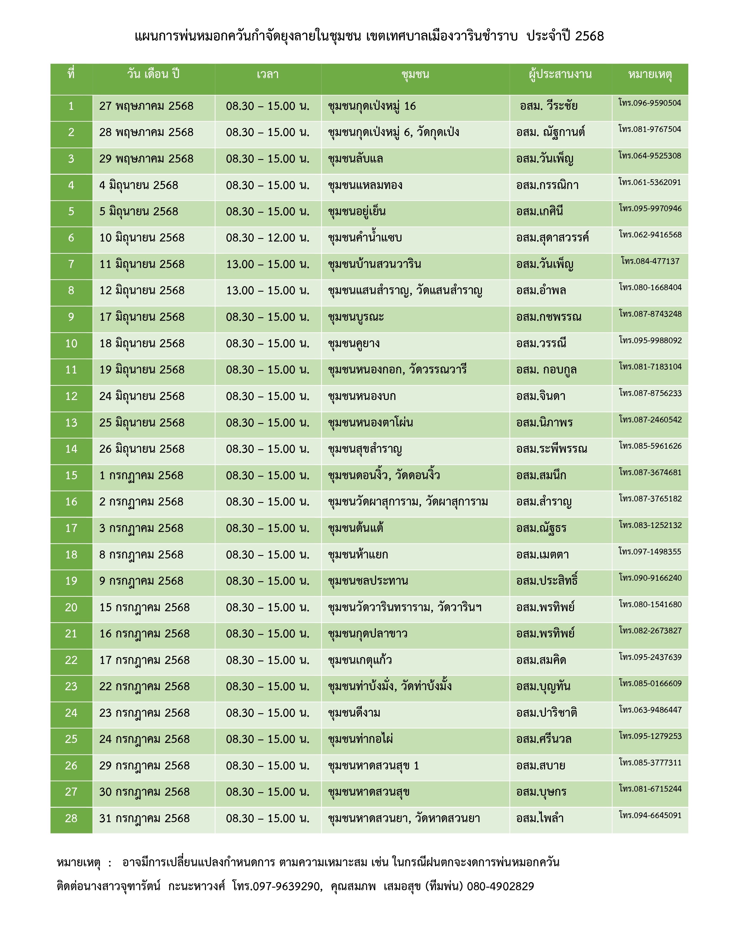 หน้าหลัก   ประชาสัมพันธ์ แผนการพ่นหมอกควันกำจัดยุงลายในชุมชน เขตเทศบาลเมืองวารินชำราบ ประจำปี 2568