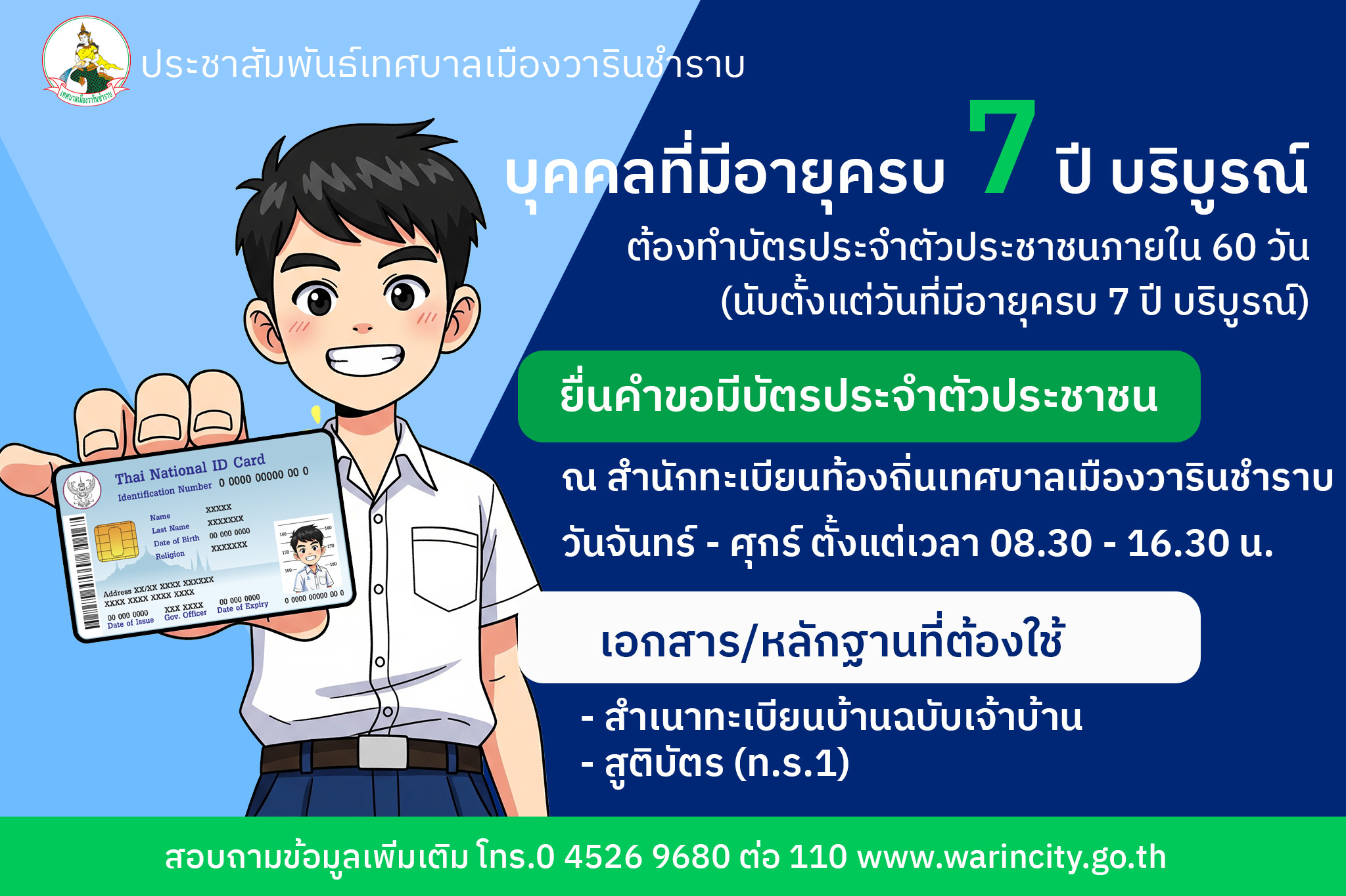หน้าหลัก   ประชาสัมพันธ์ ประชาสัมพันธ์ บุคคลที่มีอายุครบ 7 ปี บริบูรณ์ ต้องยื่นคำขอมีบัตรประจำตัวประชาชน