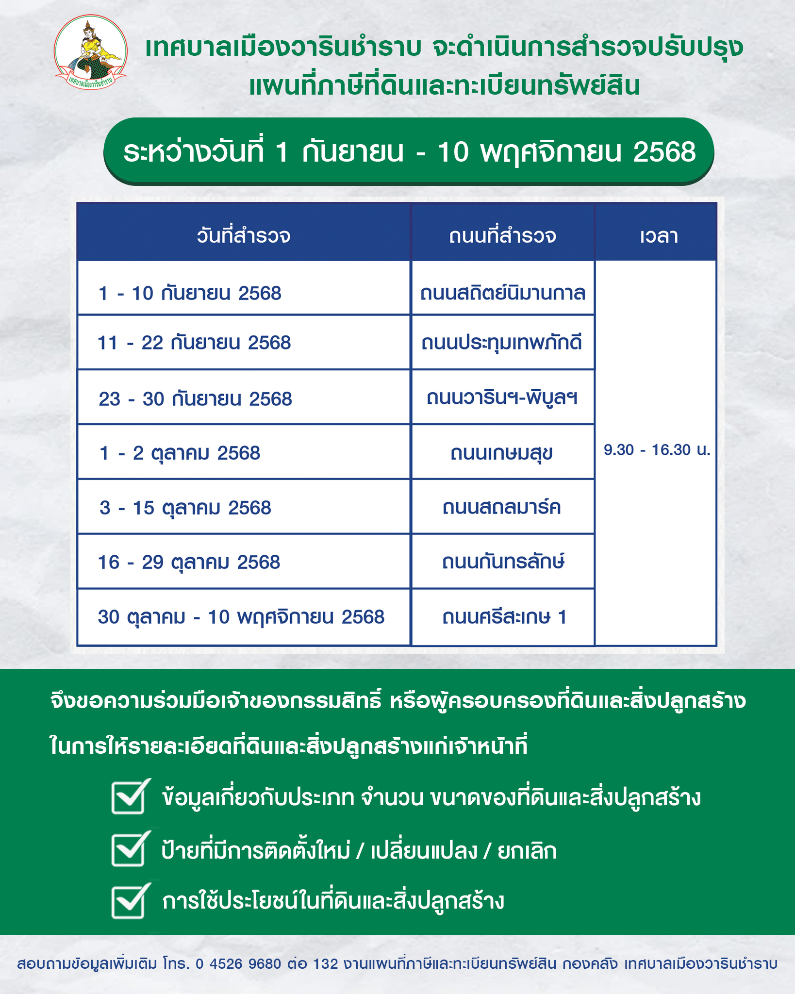 หน้าหลัก   ประชาสัมพันธ์ เทศบาลเมืองวารินชำราบ จะดำเนินการสำรวจปรับปรุงแผนที่ภาษีที่ดินและทะเบียนทรัพย์สิน ระหว่างวันที่ 1 กันยายน - 10 พฤศจิกายน 2568