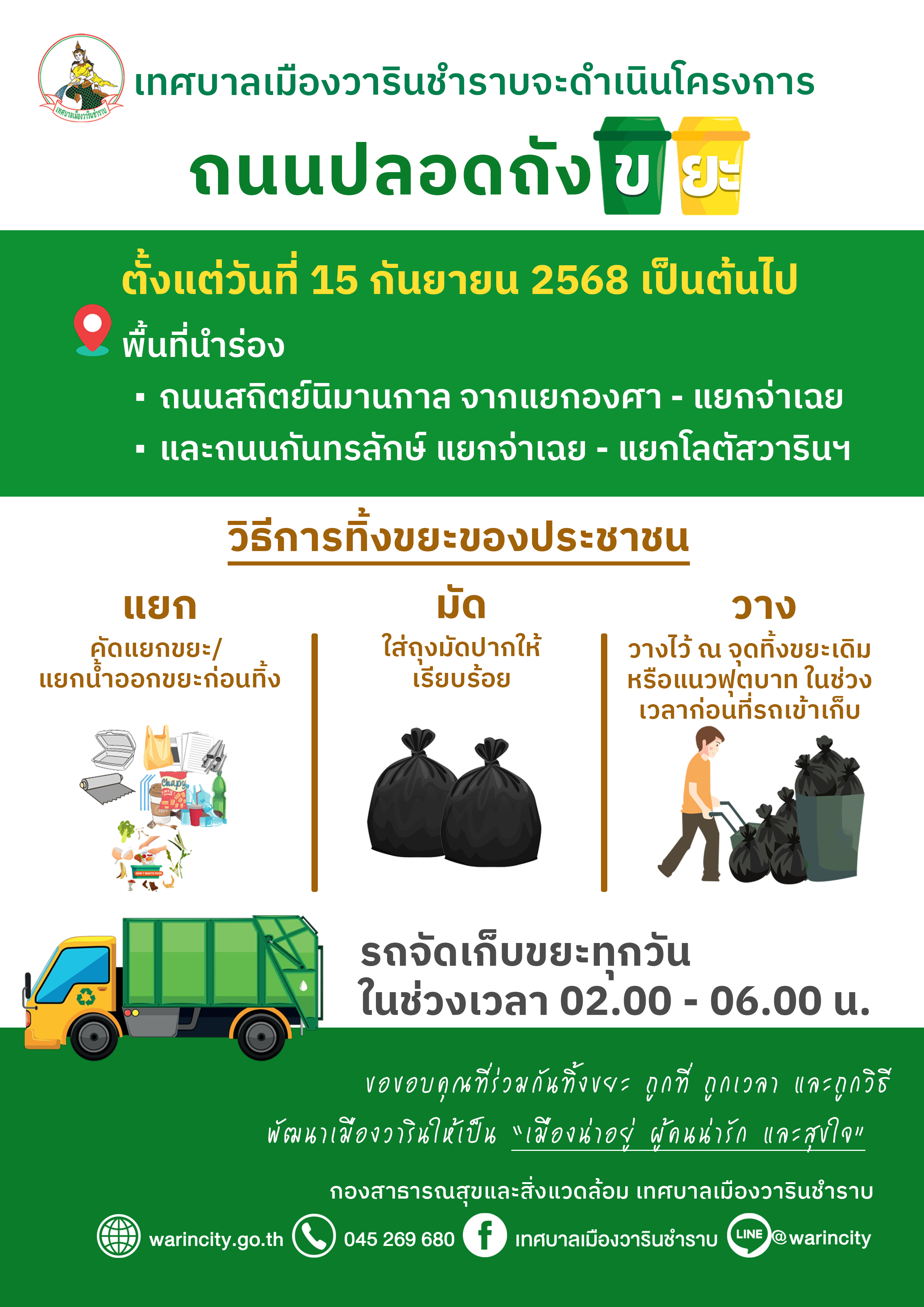 หน้าหลัก   ประชาสัมพันธ์ เทศบาลเมืองวารินชำราบ จะดำเนินโครงการถนนปลอดถังขยะ ตั้งแต่วันที่ 15 กันยายน 2568 เป็นต้นไป