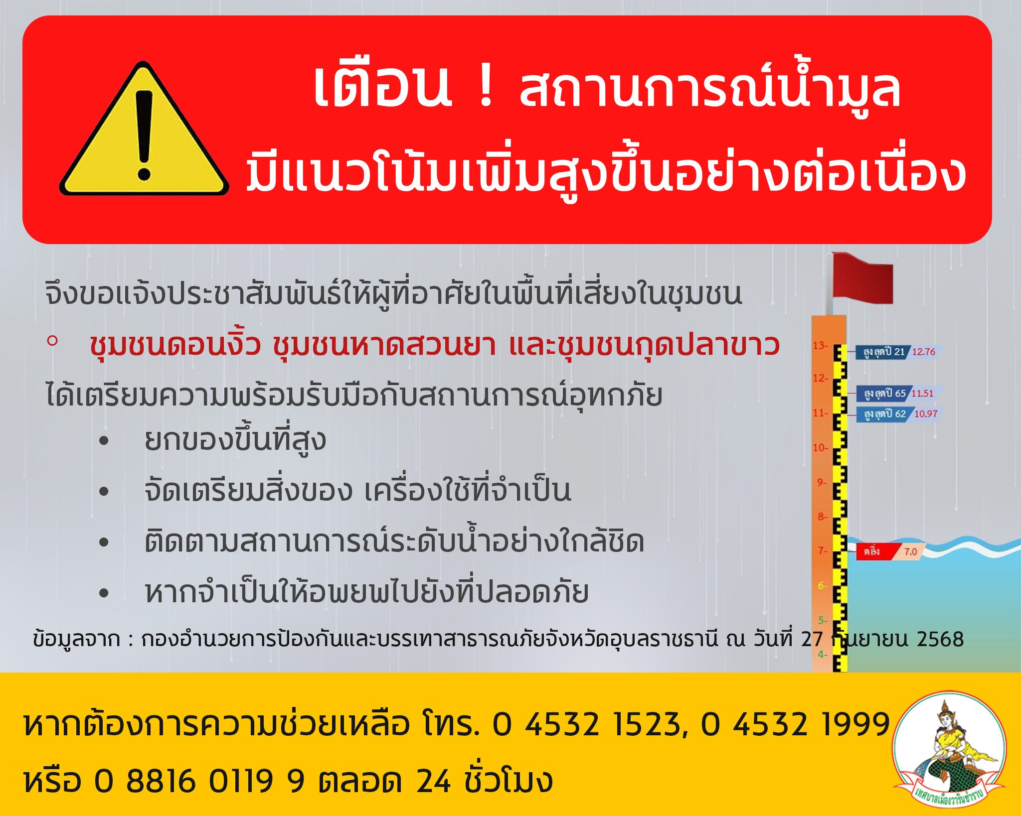 หน้าหลัก   ประชาสัมพันธ์ ประชาสัมพันธ์ ให้ผู้ที่อาศัยในพื้นที่เสี่ยง ได้แก่ ชุมชนดอนงิ้ว หาดสวนยา และกุดปลาขาว ได้เตรียมความพร้อมรับมือกับสถานการณ์อุทกภัย